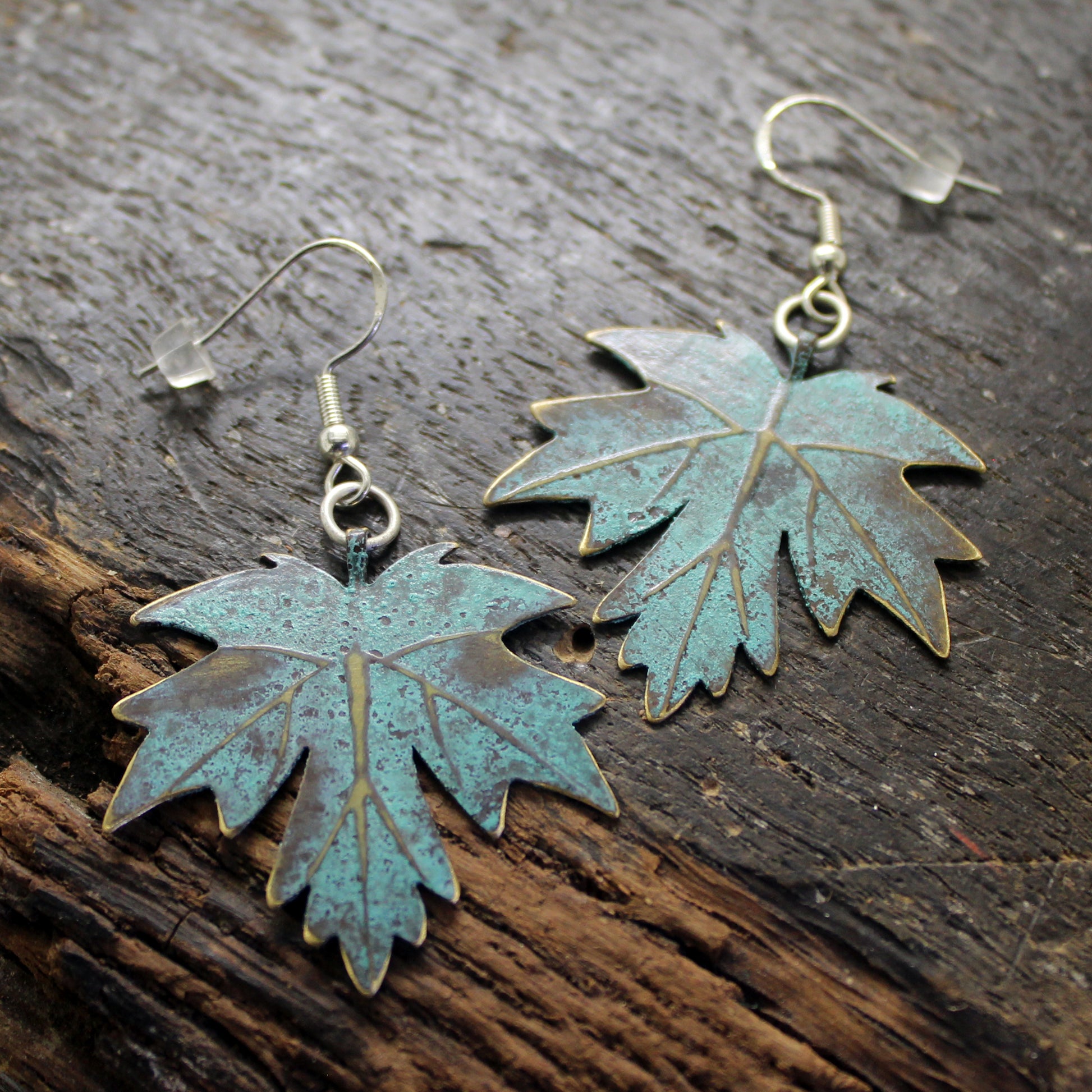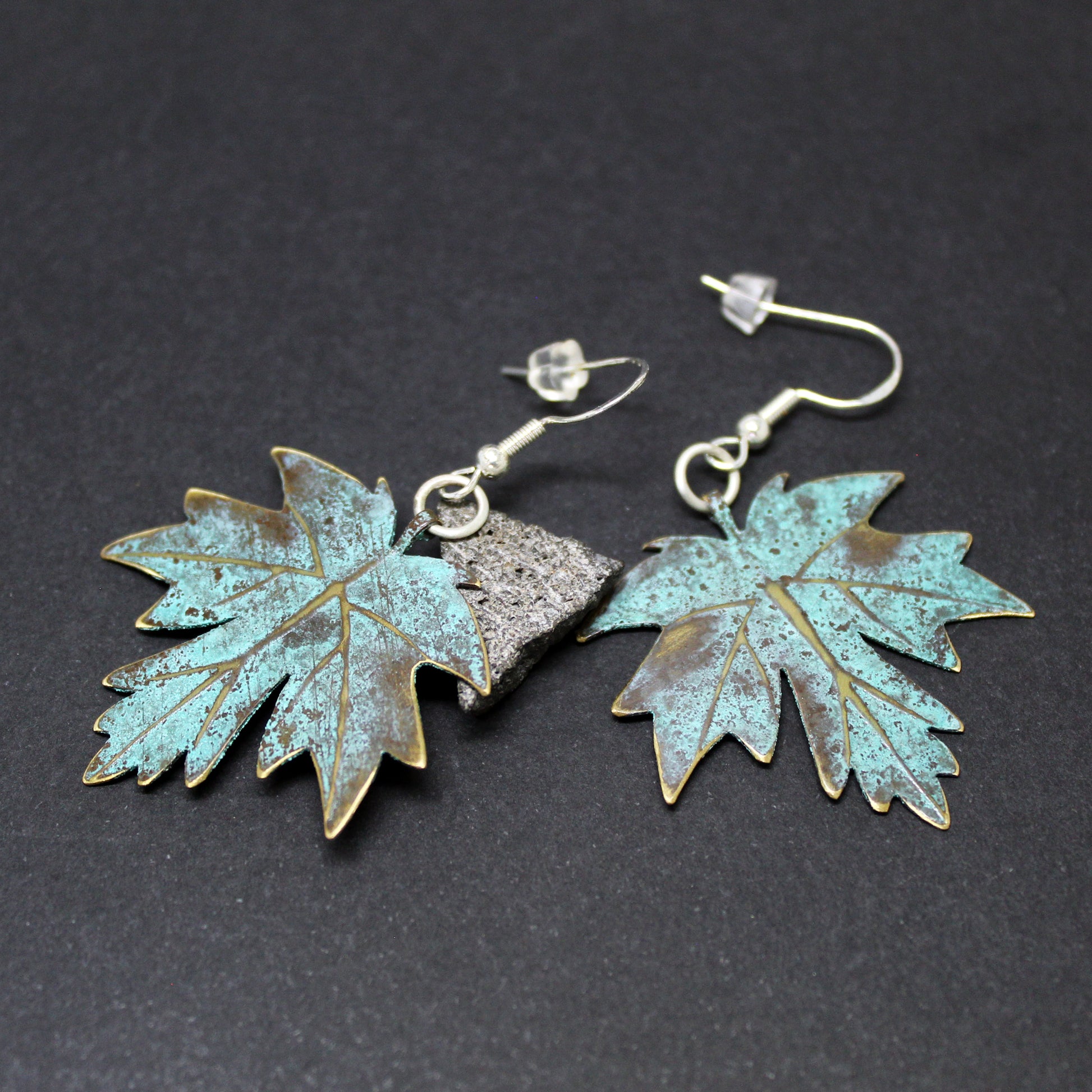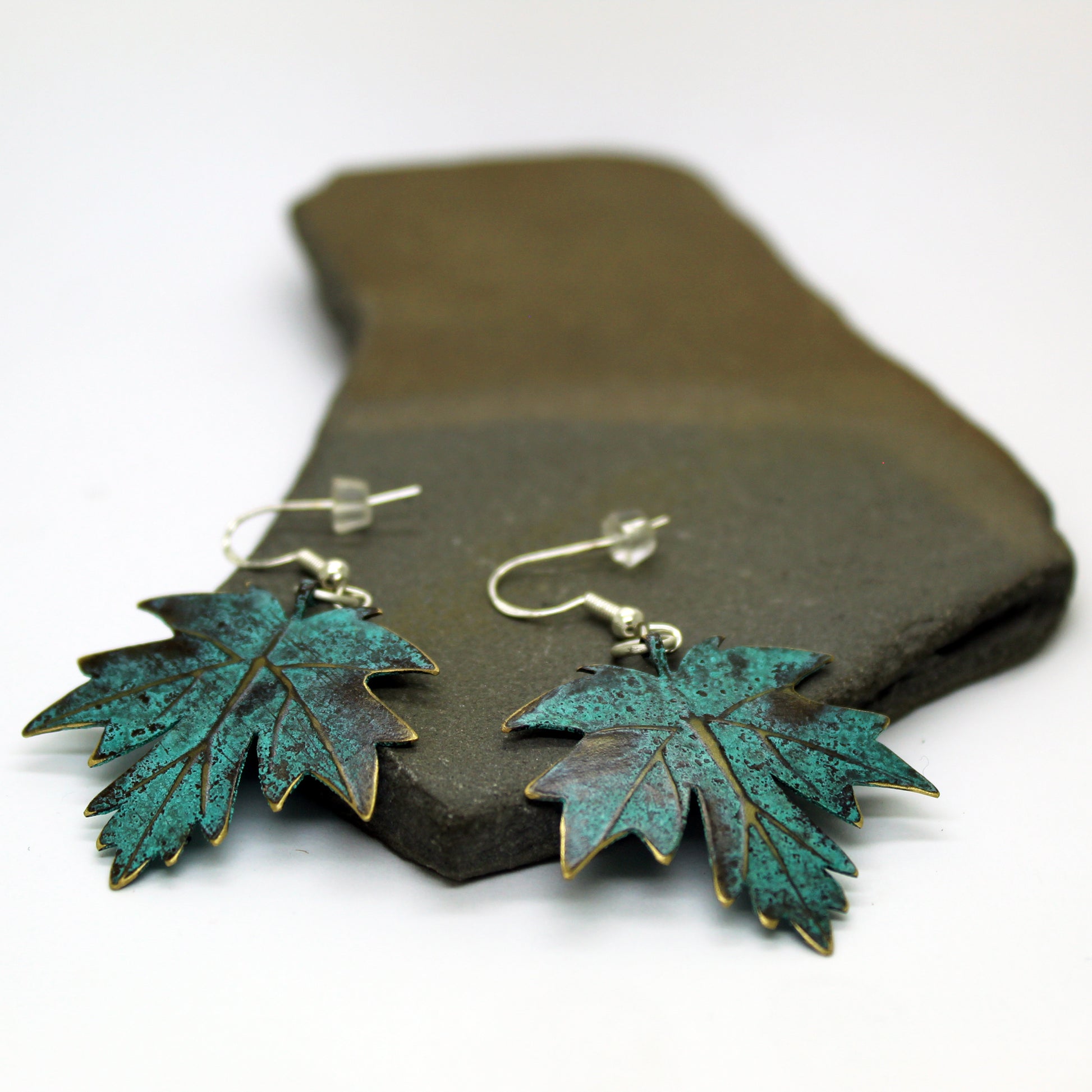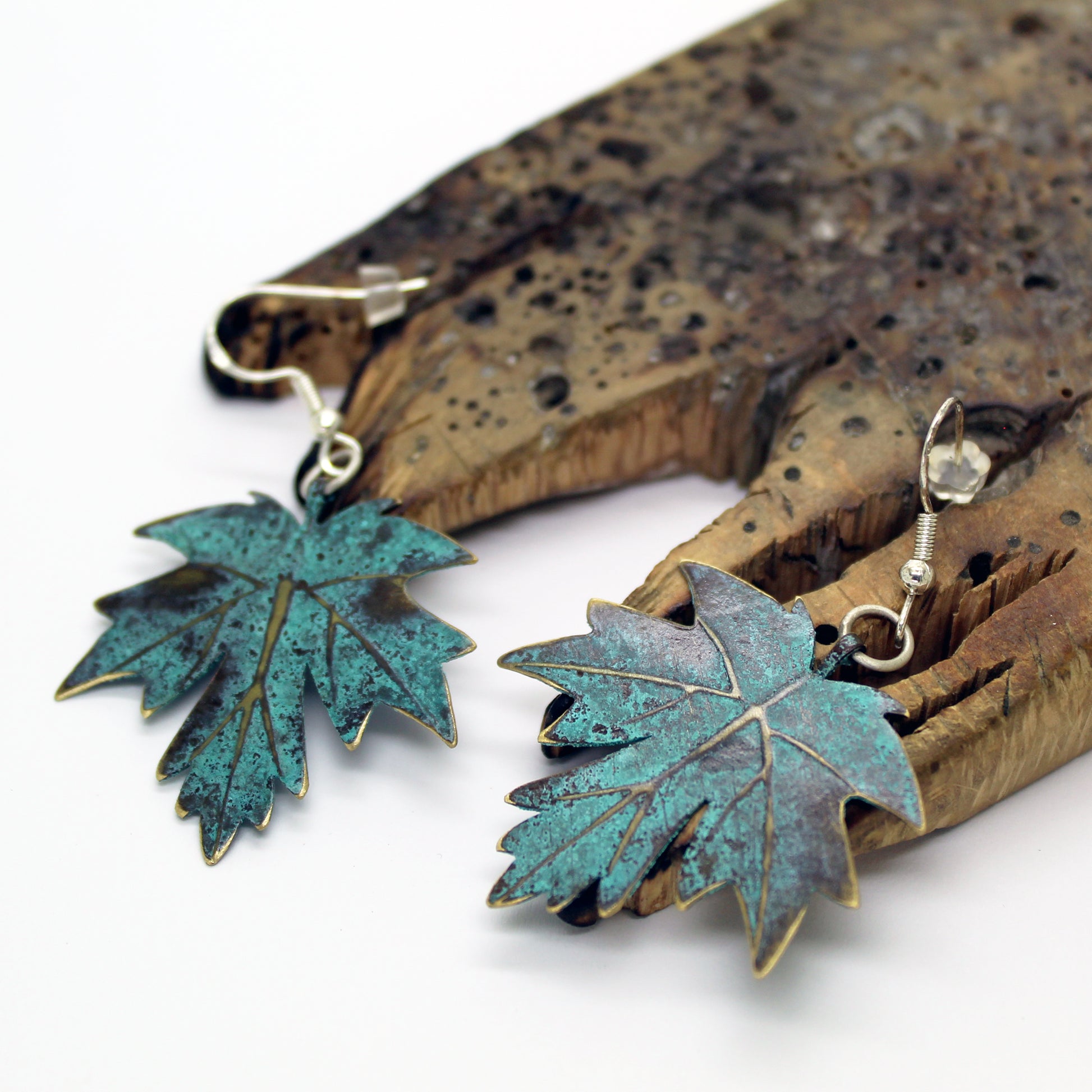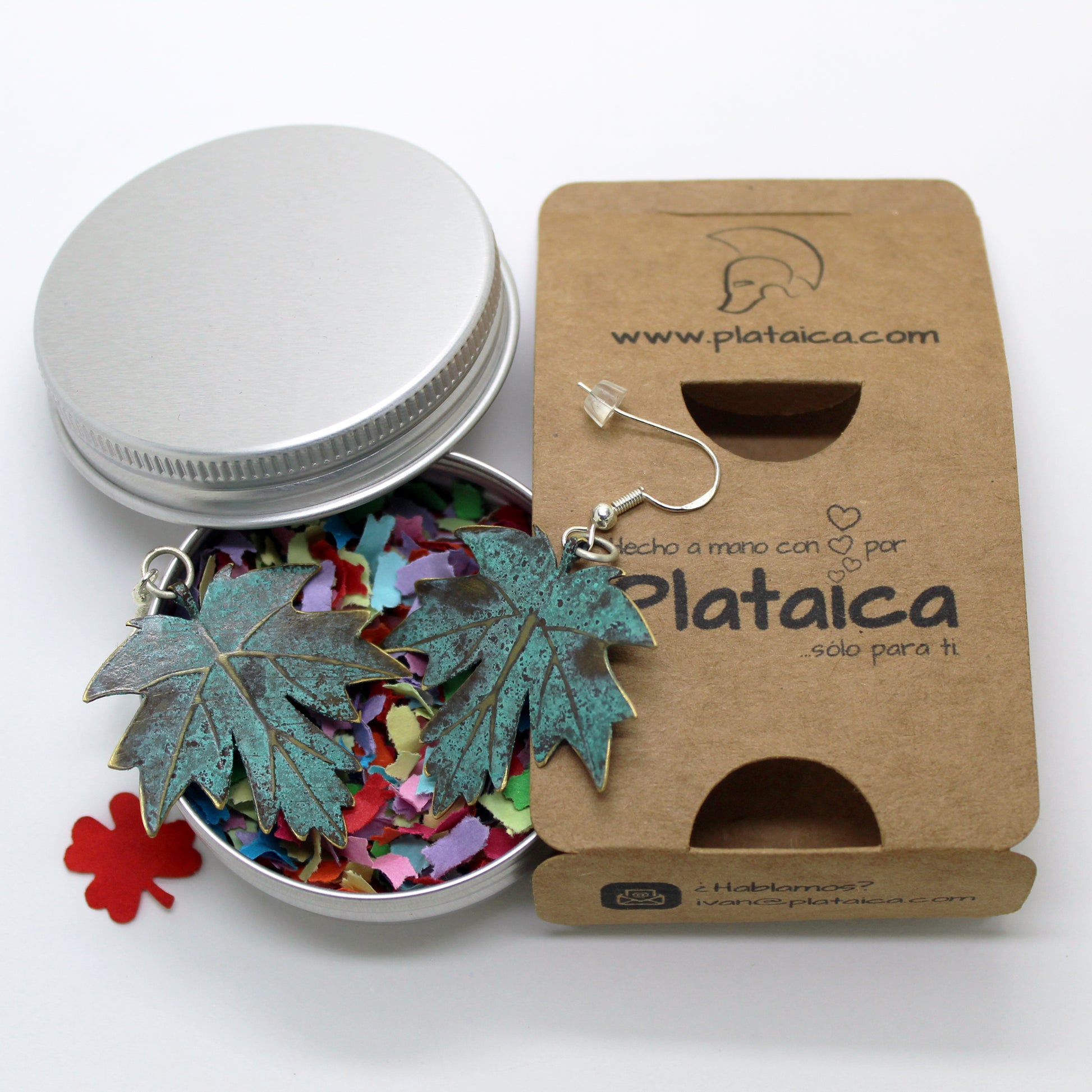 Unas preciosas hojas de arce realizadas a mano en latón con argolla y gancho de plata 925. Están rematadas con una fina pátina de color verde azulado, que resalta el brillo del latón.