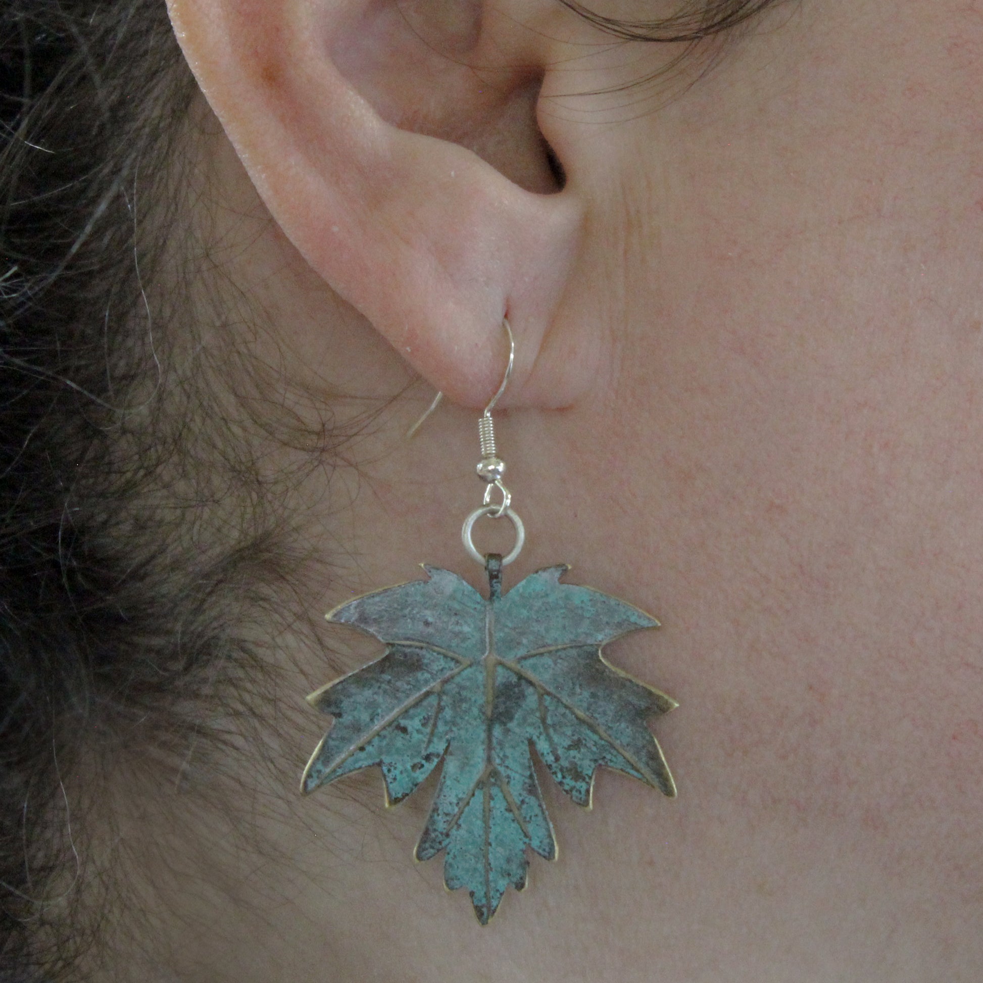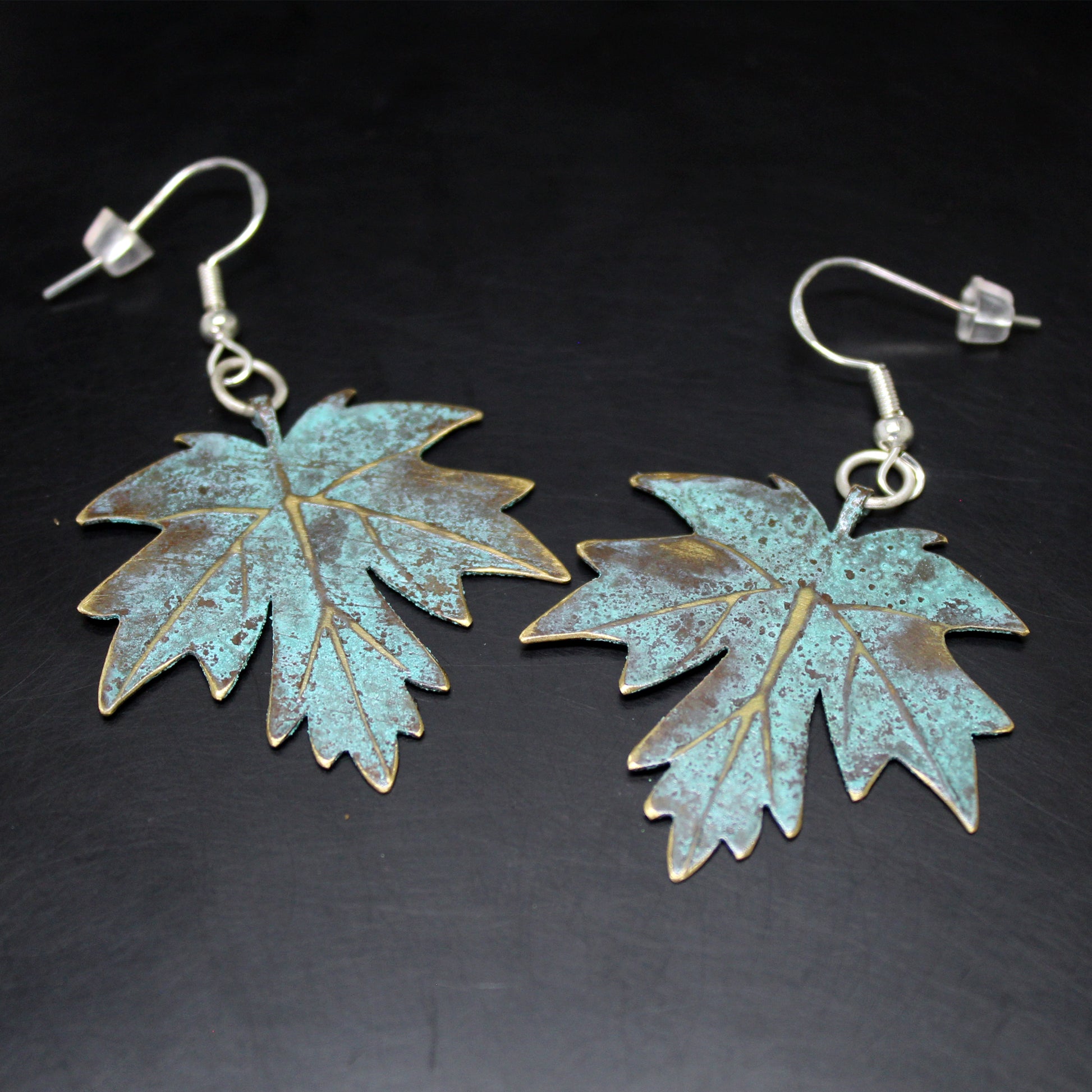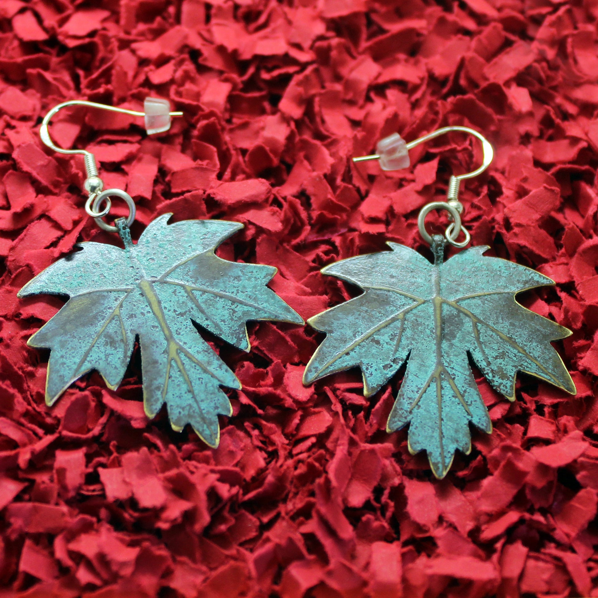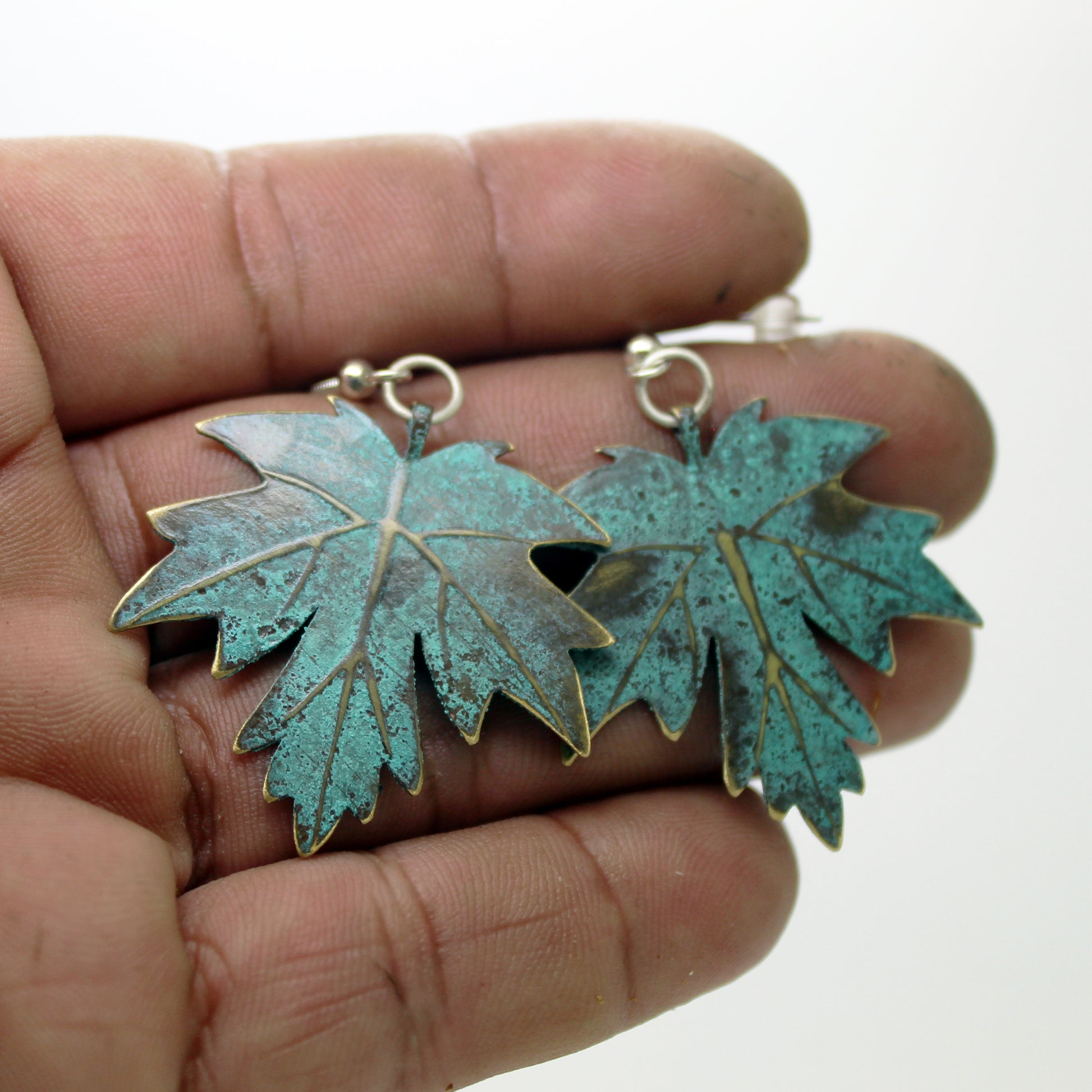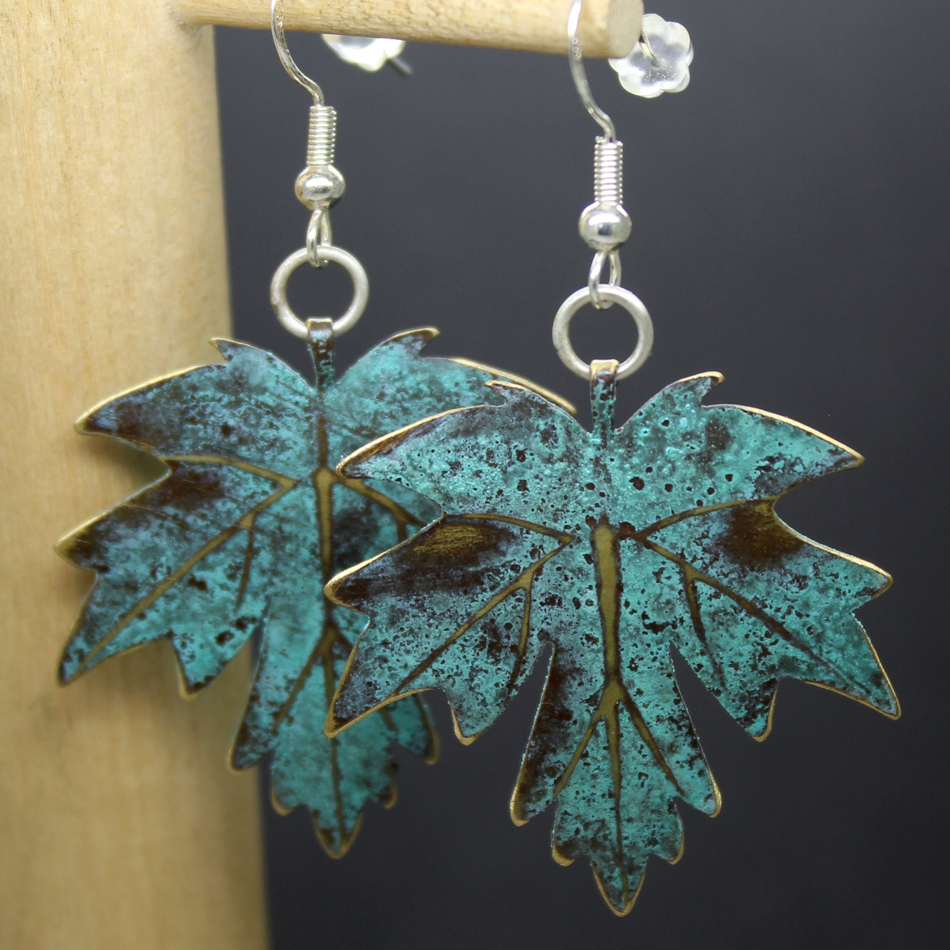 Unas preciosas hojas de arce realizadas a mano en latón con argolla y gancho de plata 925. Están rematadas con una fina pátina de color verde azulado, que resalta el brillo del latón.