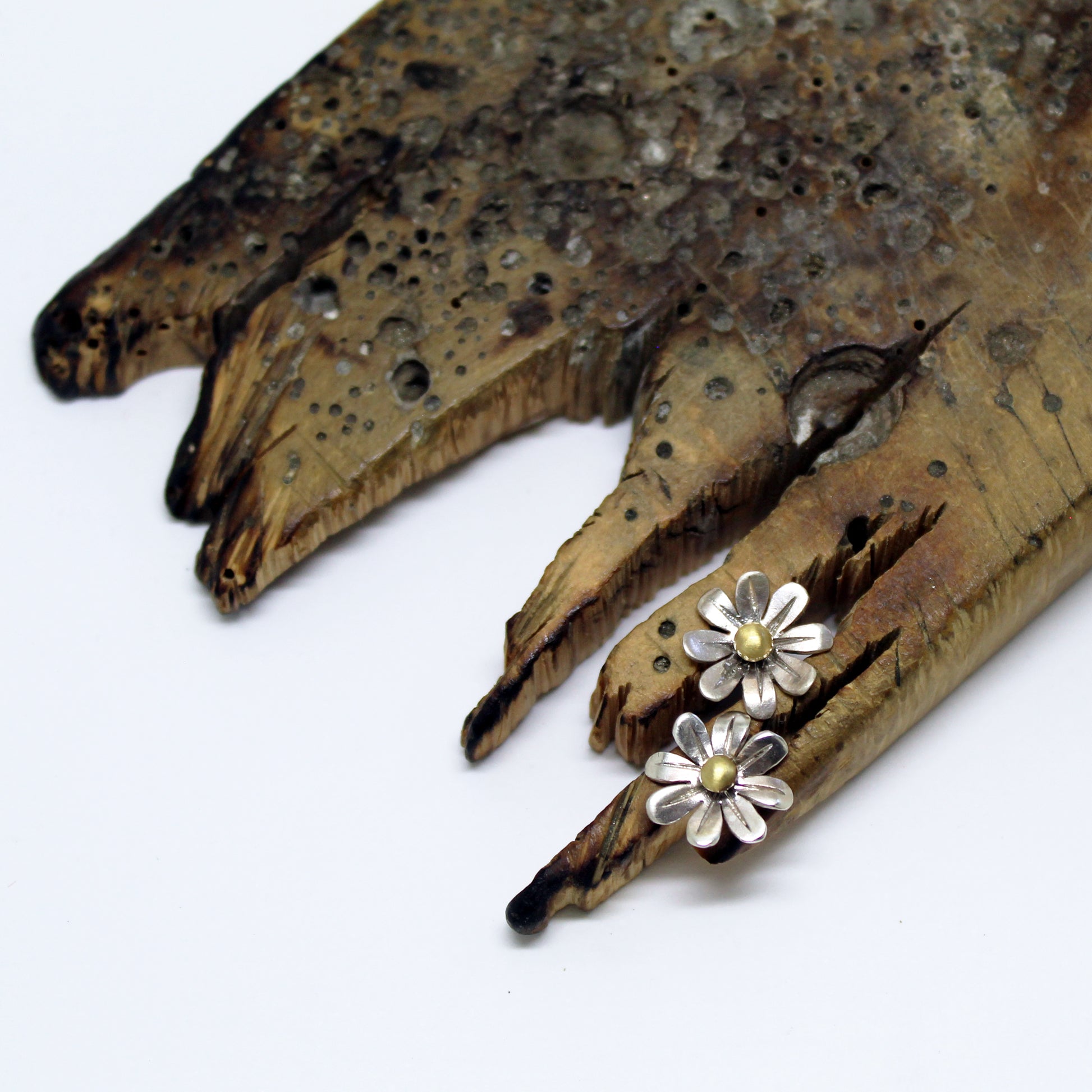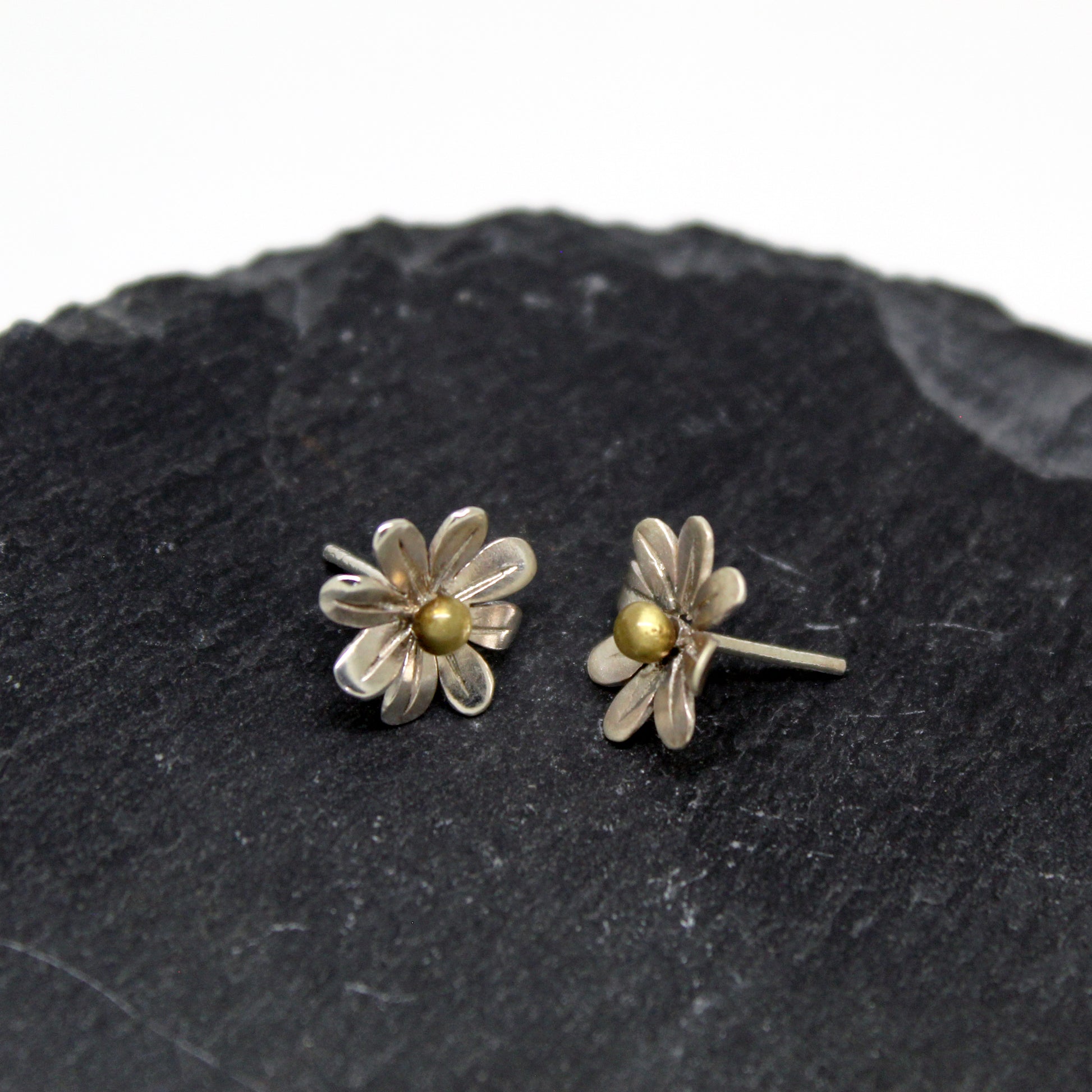 Estos mini pendientes en forma de margarita están cuidadosamente elaborados a mano con pétalos de plata y el centro de latón, protegido con una capa de resina UV transparente para conservar su brillo natural y evitar oxidación.