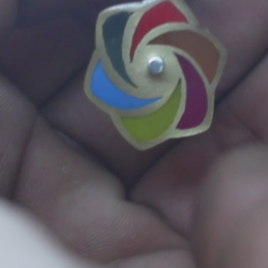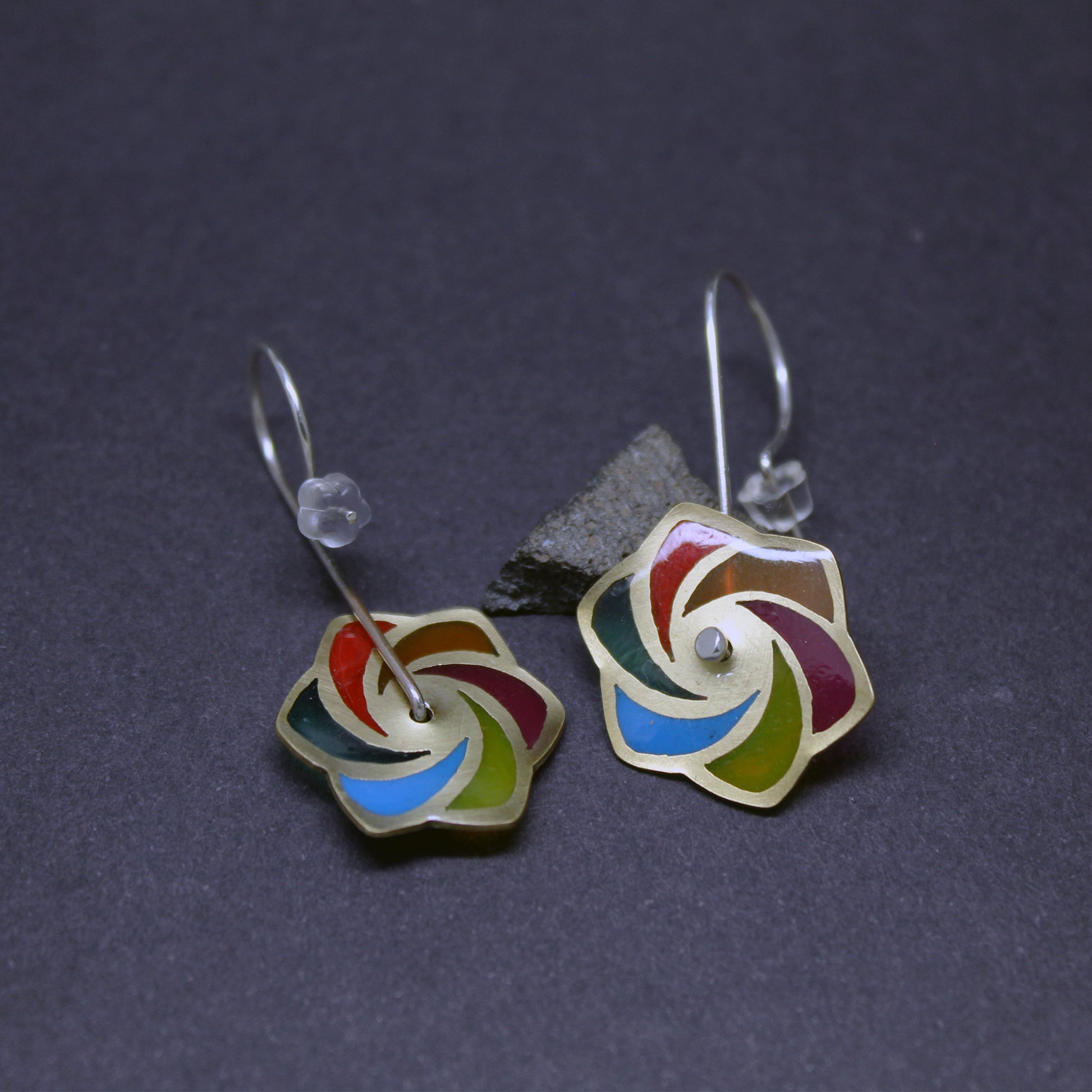 Inspirados en los divertidos molinillos de viento infantiles, estos pendientes móviles están calados a mano en latón y decorados con resina UV en colores semitransparentes que capturan y reflejan la luz con cada movimiento.