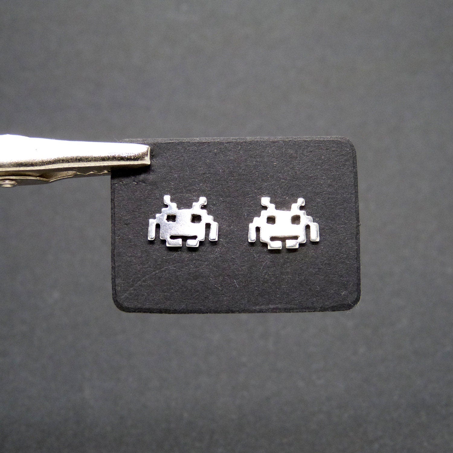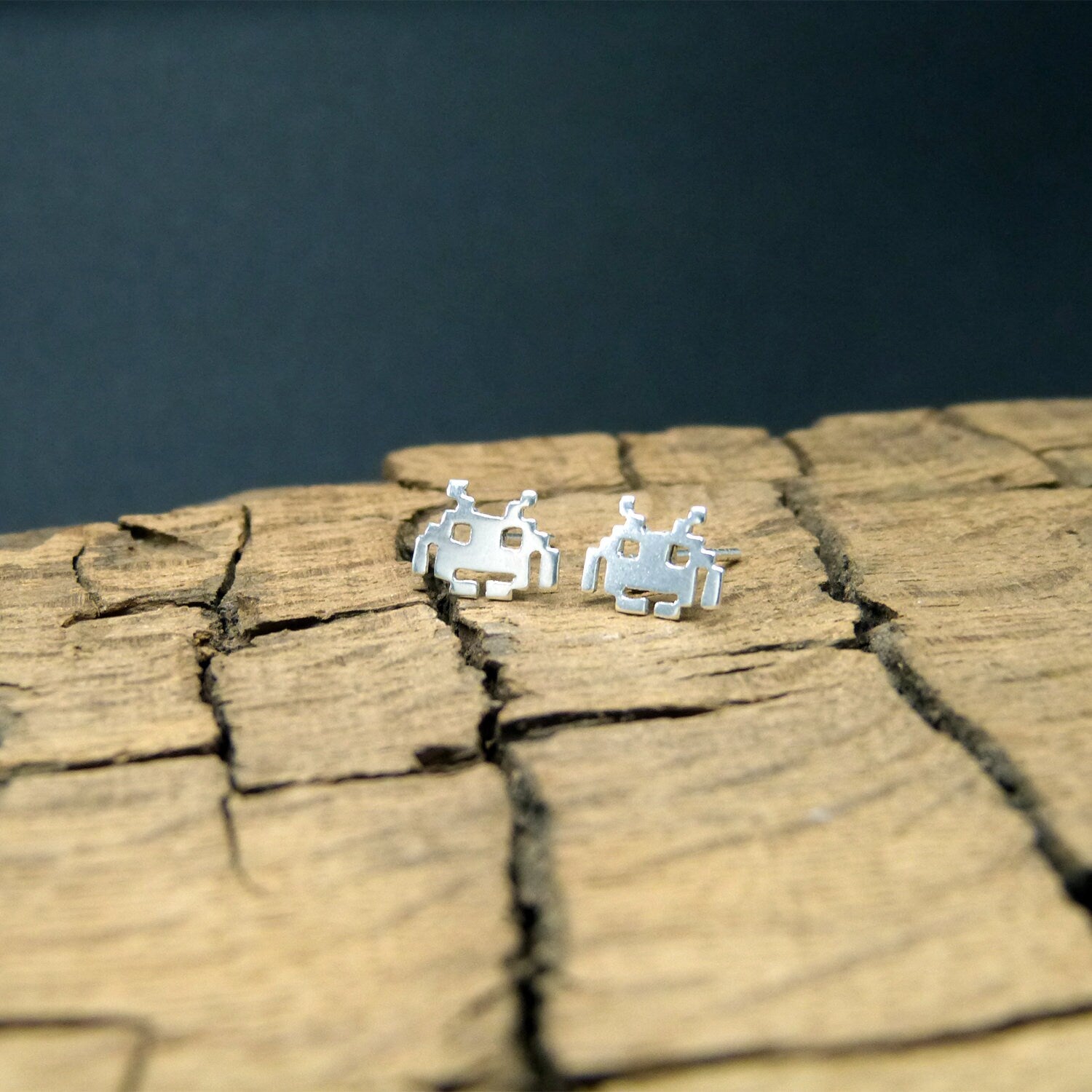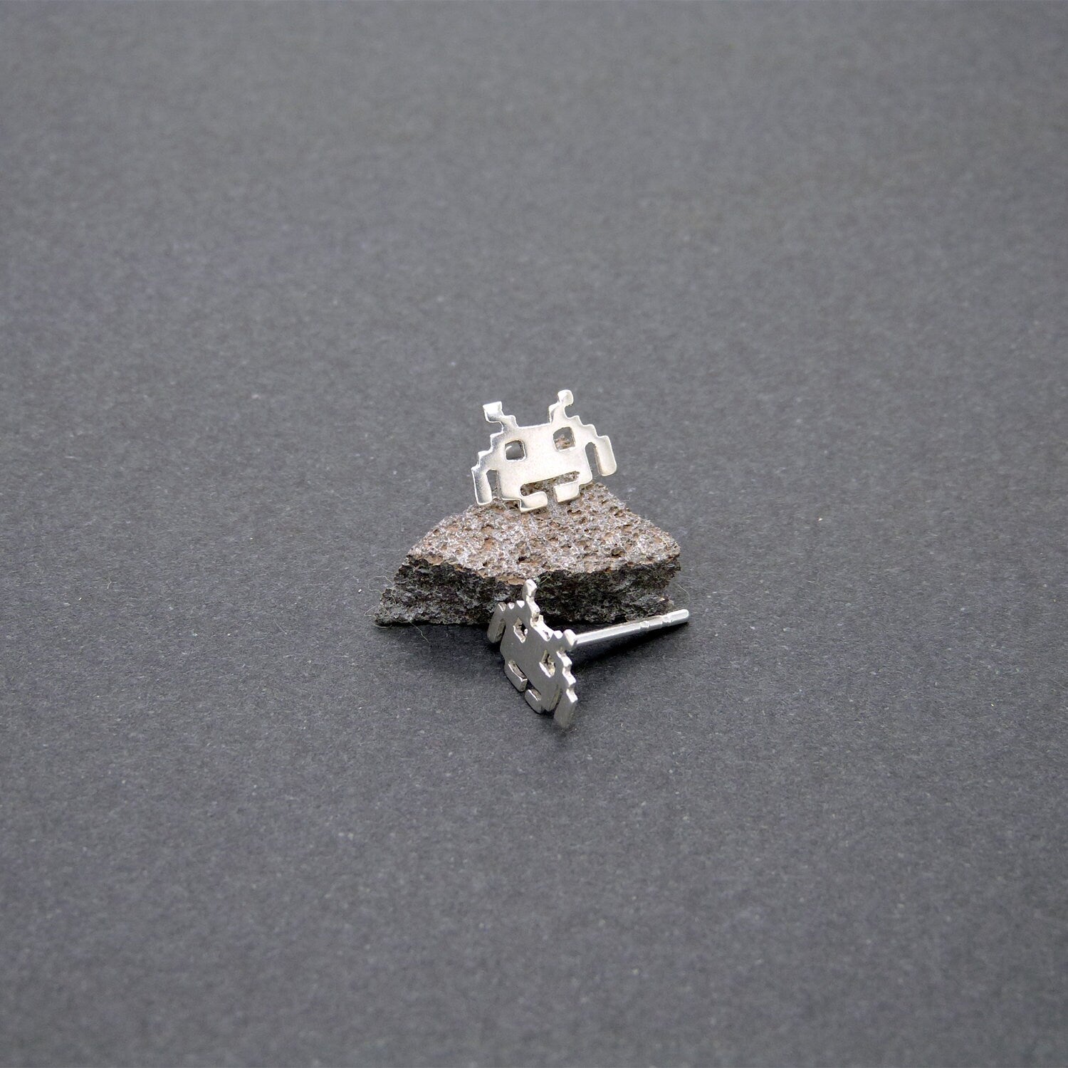 Very small earrings to wear attached to the lobe and use daily for your comfort. A perfect gift for that little geek person in love with video games and 8-bits who surely spent a lot of coins playing Space Invaders ;-)