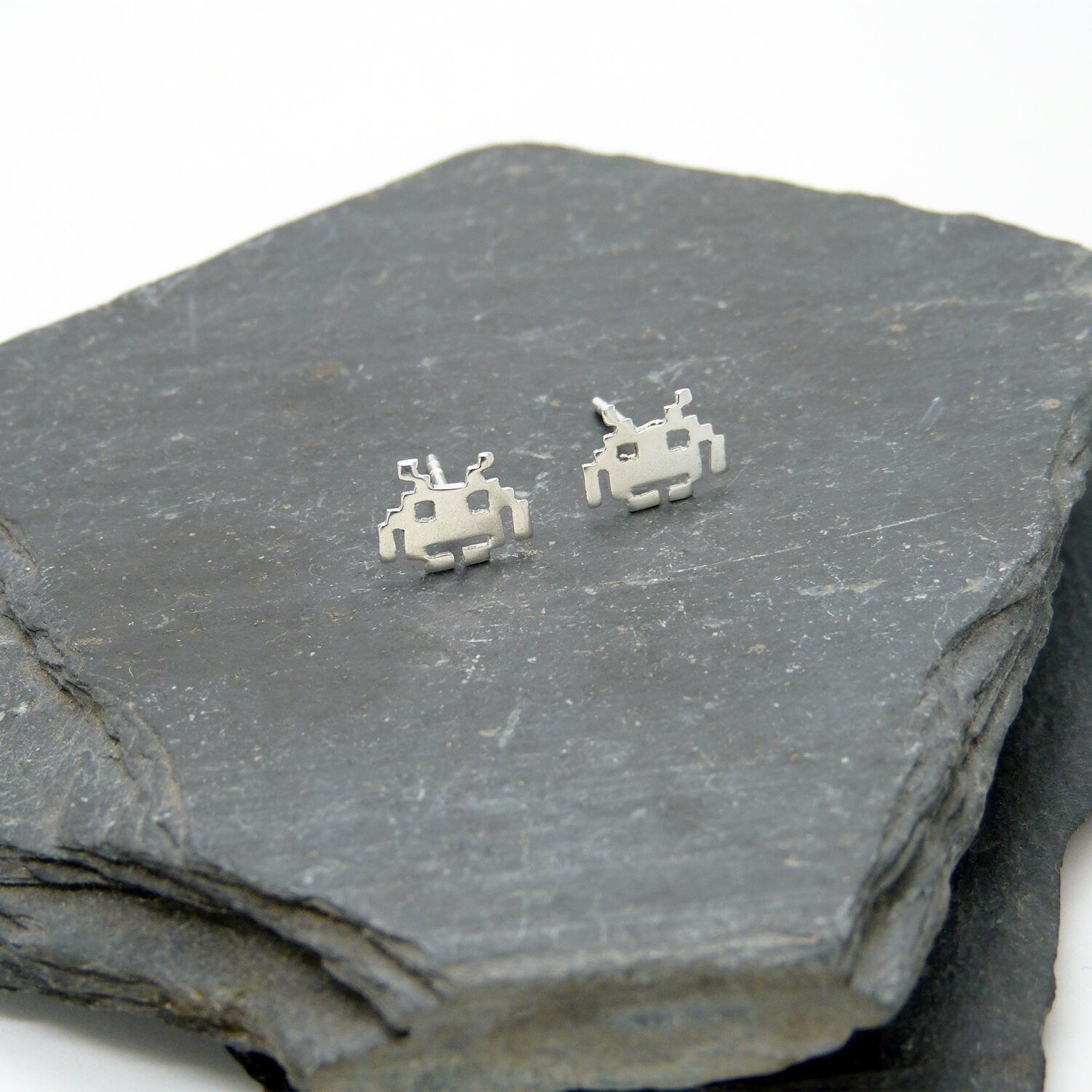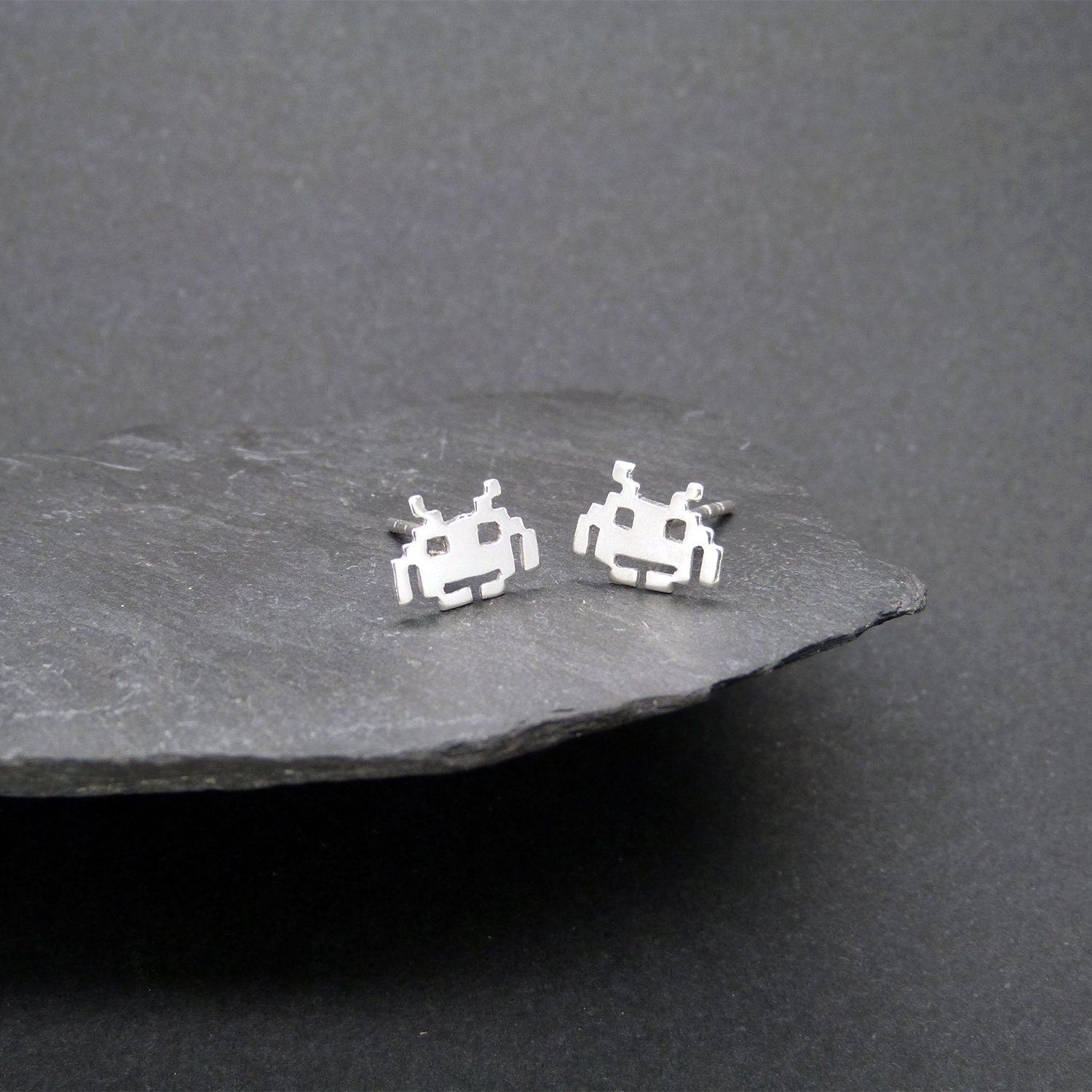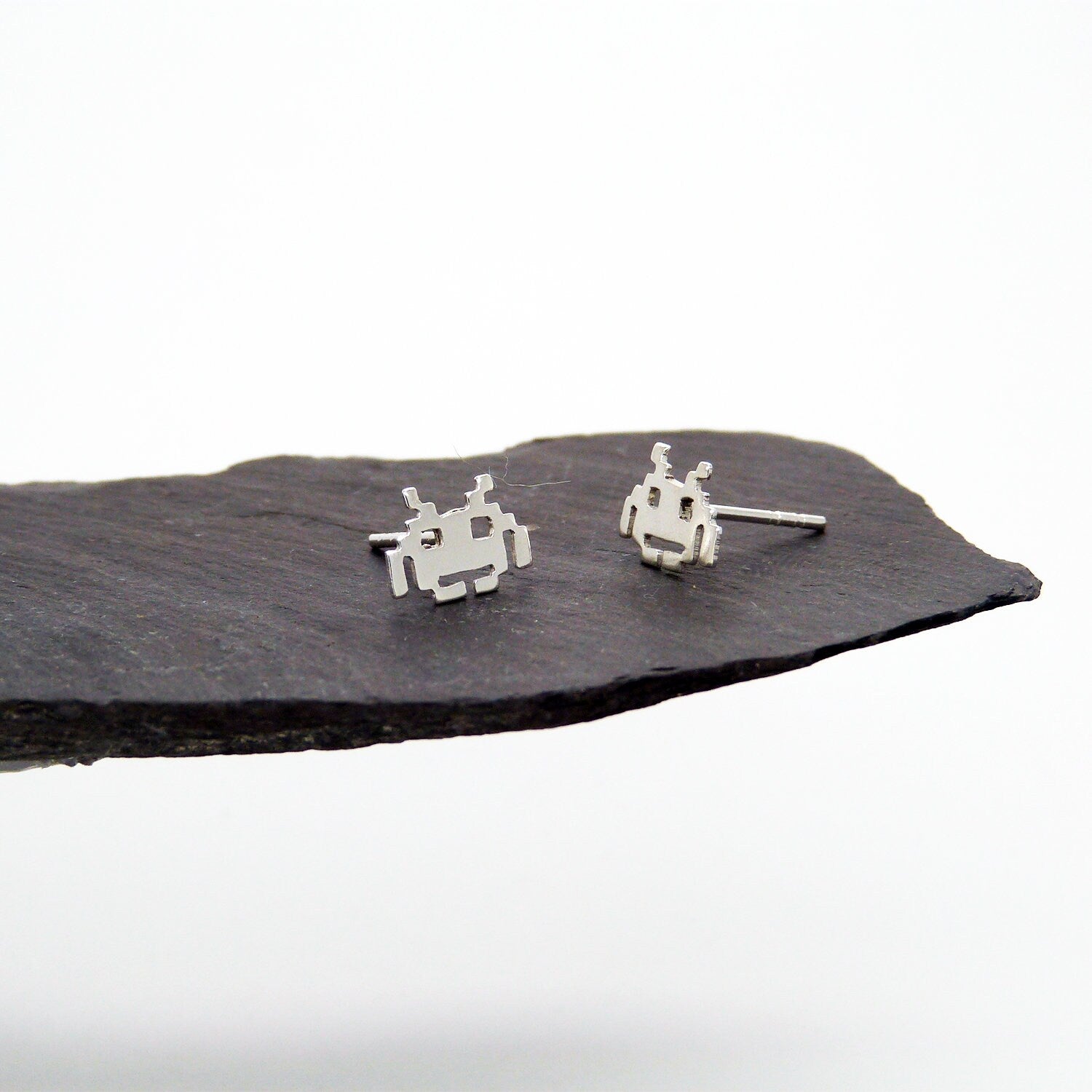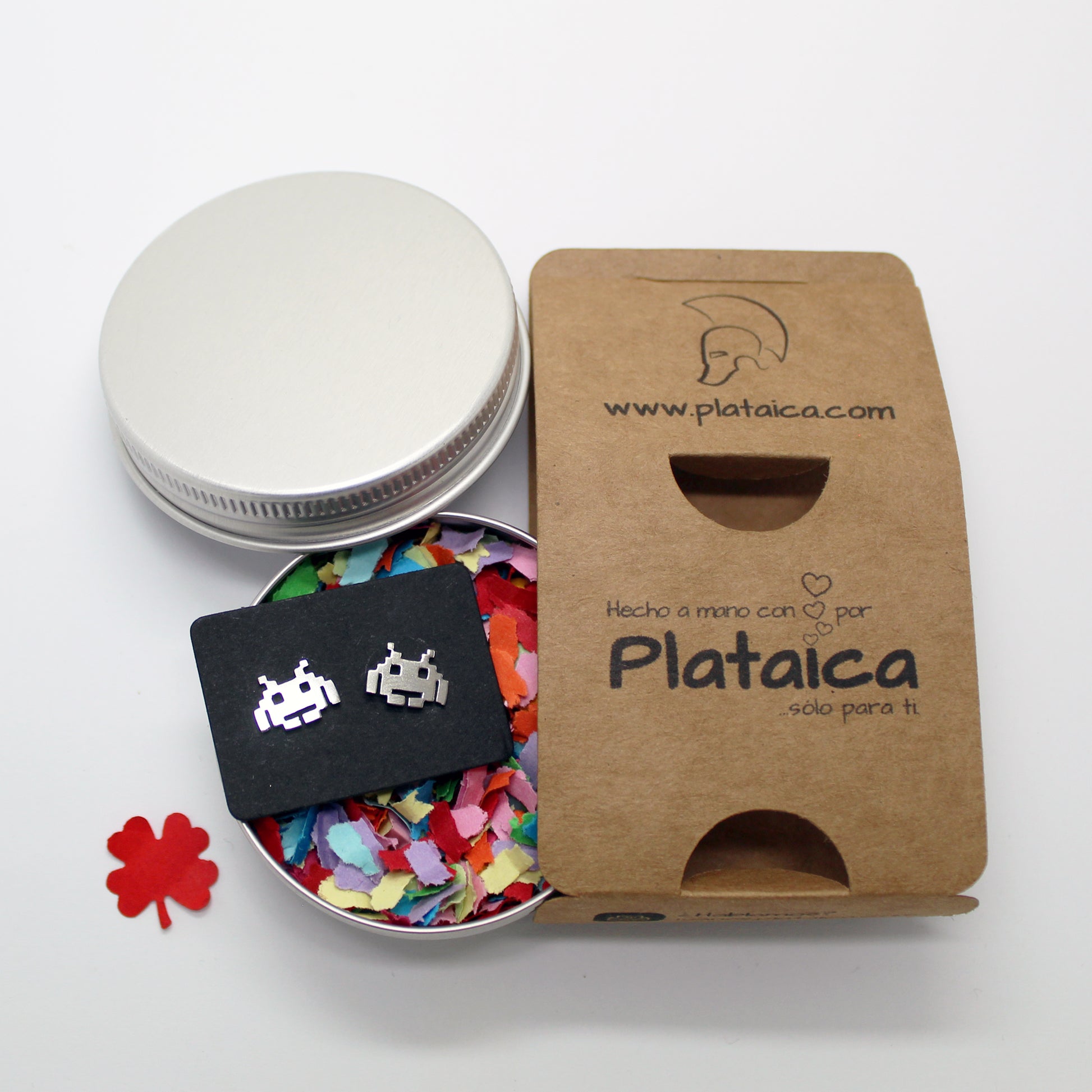 Very small earrings to wear attached to the lobe and use daily for your comfort. A perfect gift for that little geek person in love with video games and 8-bits who surely spent a lot of coins playing Space Invaders ;-)