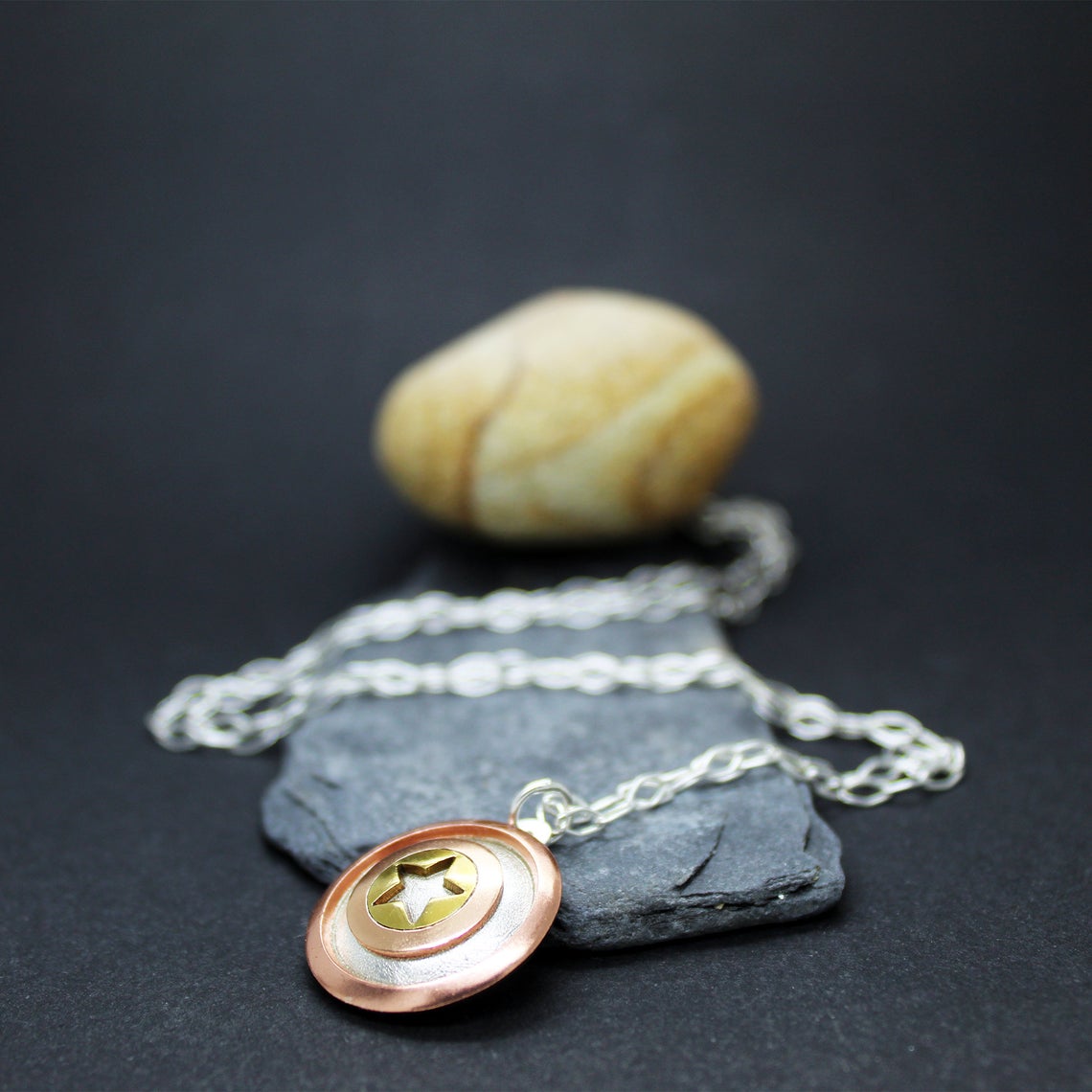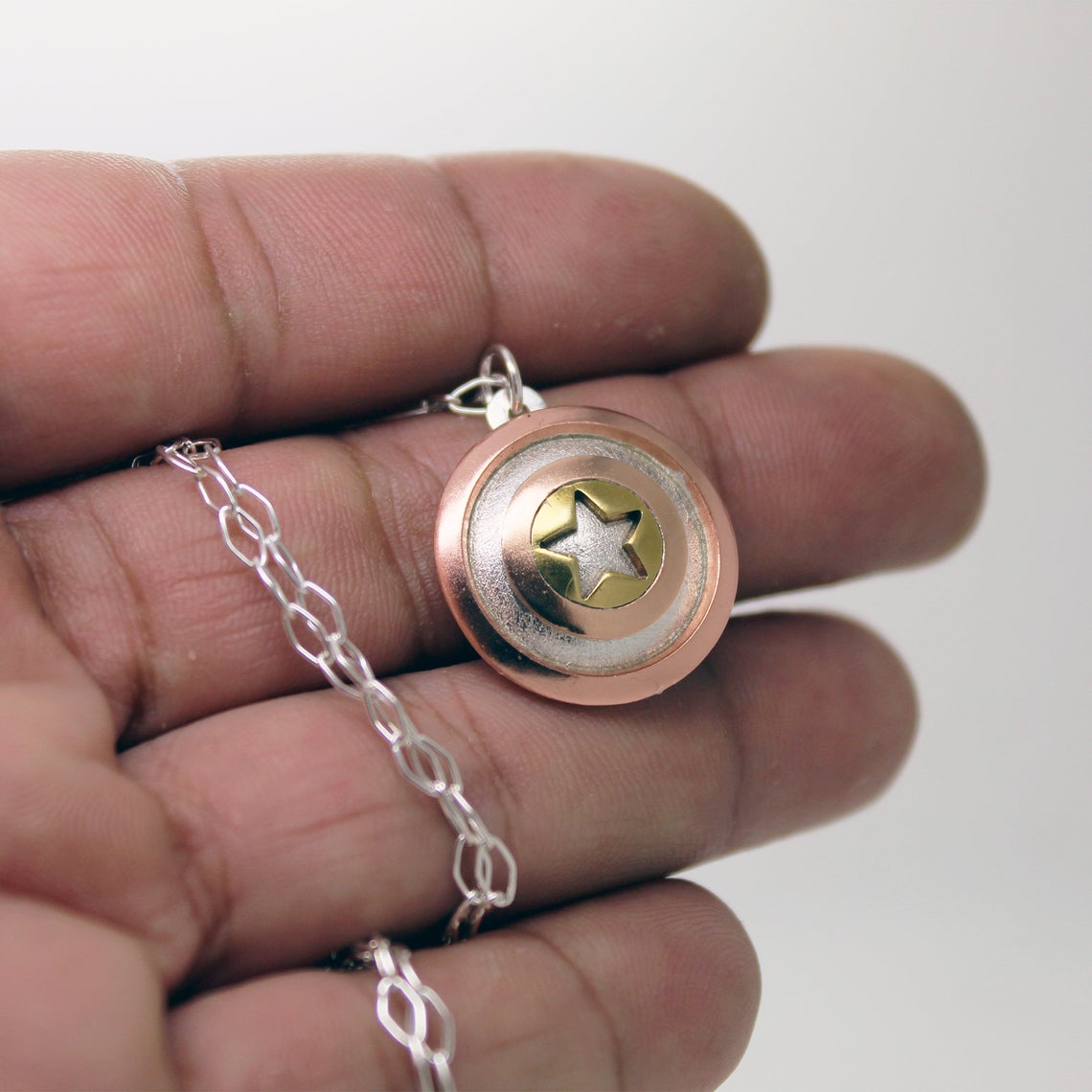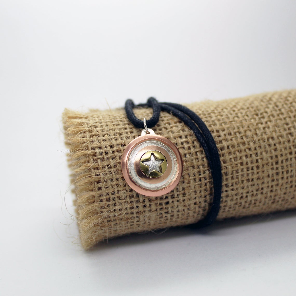 Un colgante perfecto para quien adora los superhéroes. La parte trasera, en contacto con la piel es de plata 925 para evitar alergias. El colgante representa el escudo del Capitán América realizado en plata y cobre, con la estrella central recortada en una pequeña pieza de latón.