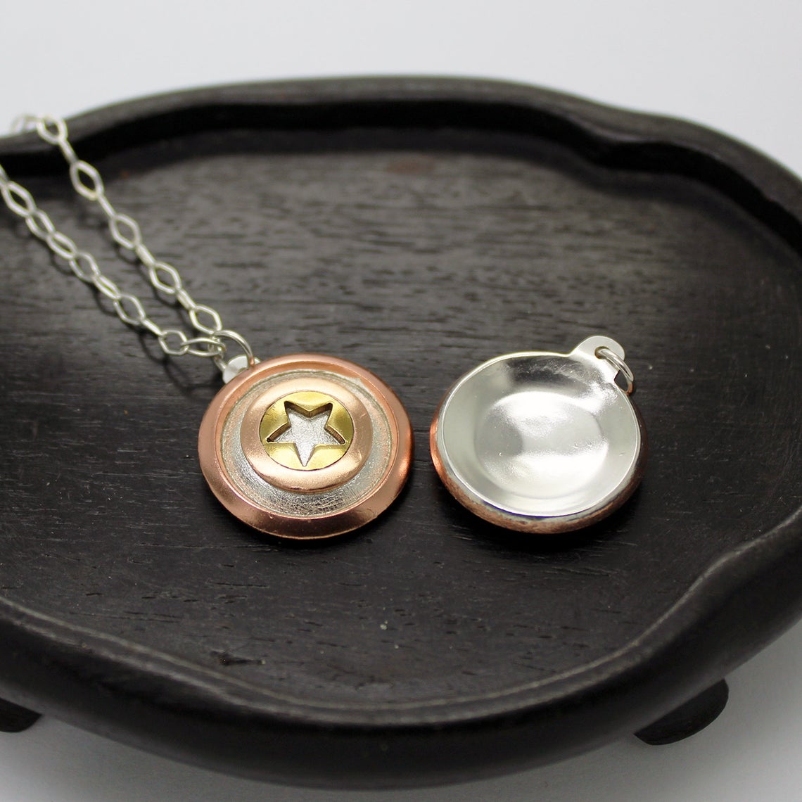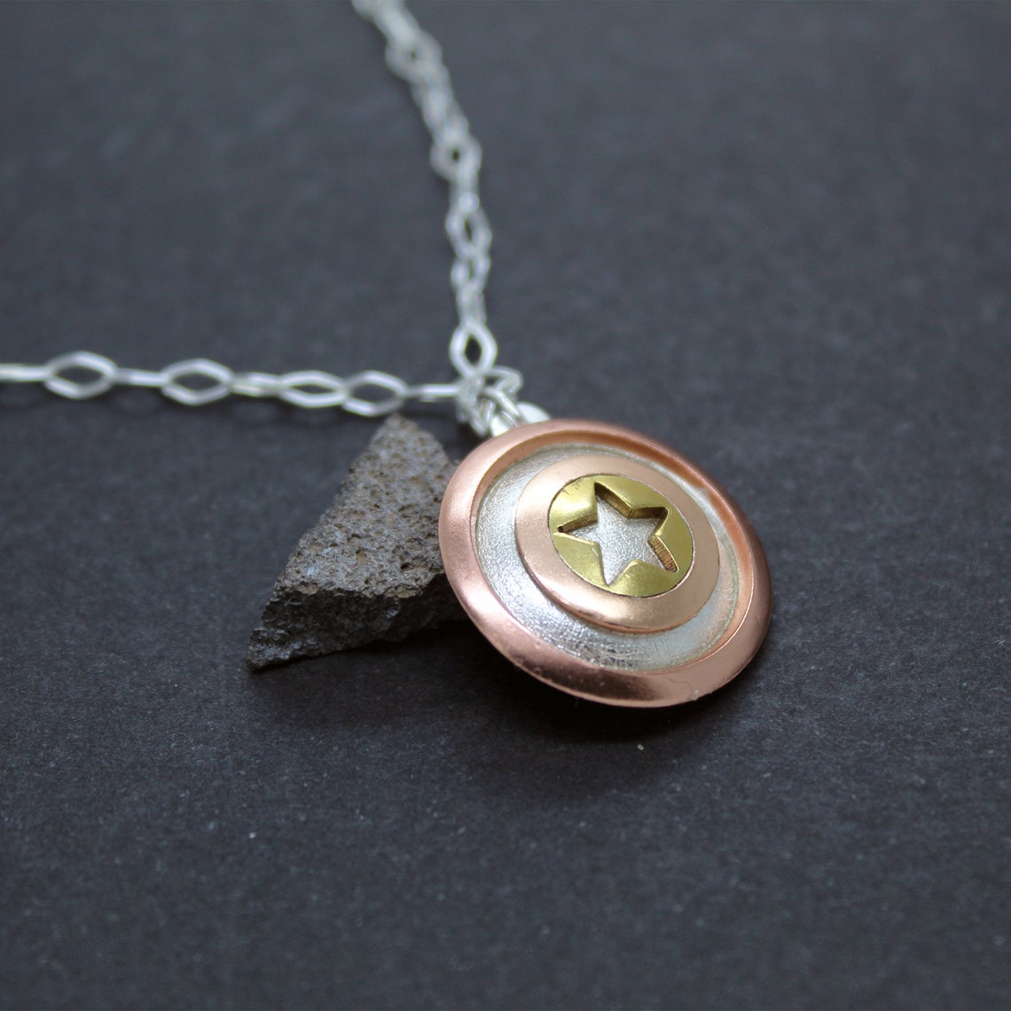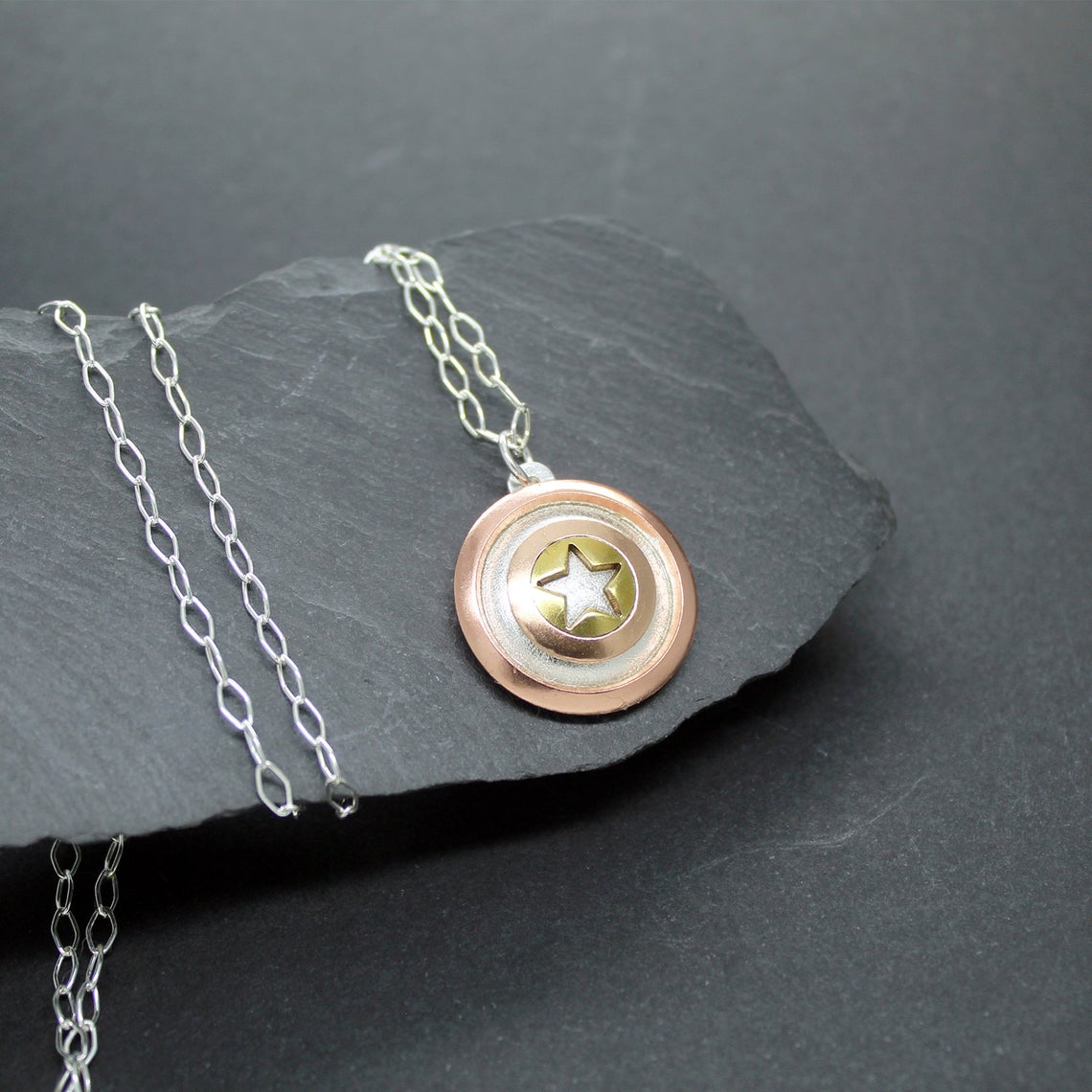 Un colgante perfecto para quien adora los superhéroes. La parte trasera, en contacto con la piel es de plata 925 para evitar alergias. El colgante representa el escudo del Capitán América realizado en plata y cobre, con la estrella central recortada en una pequeña pieza de latón.