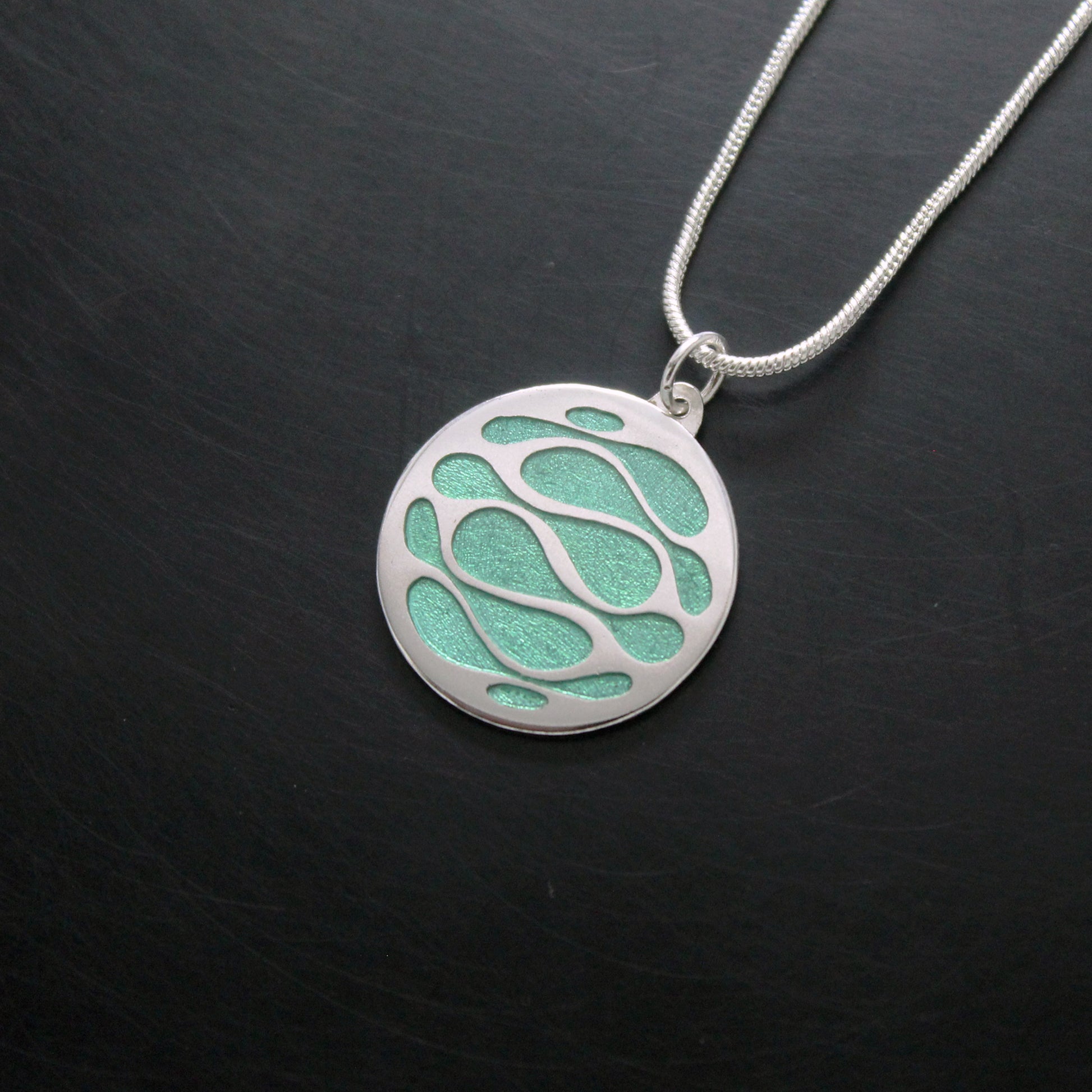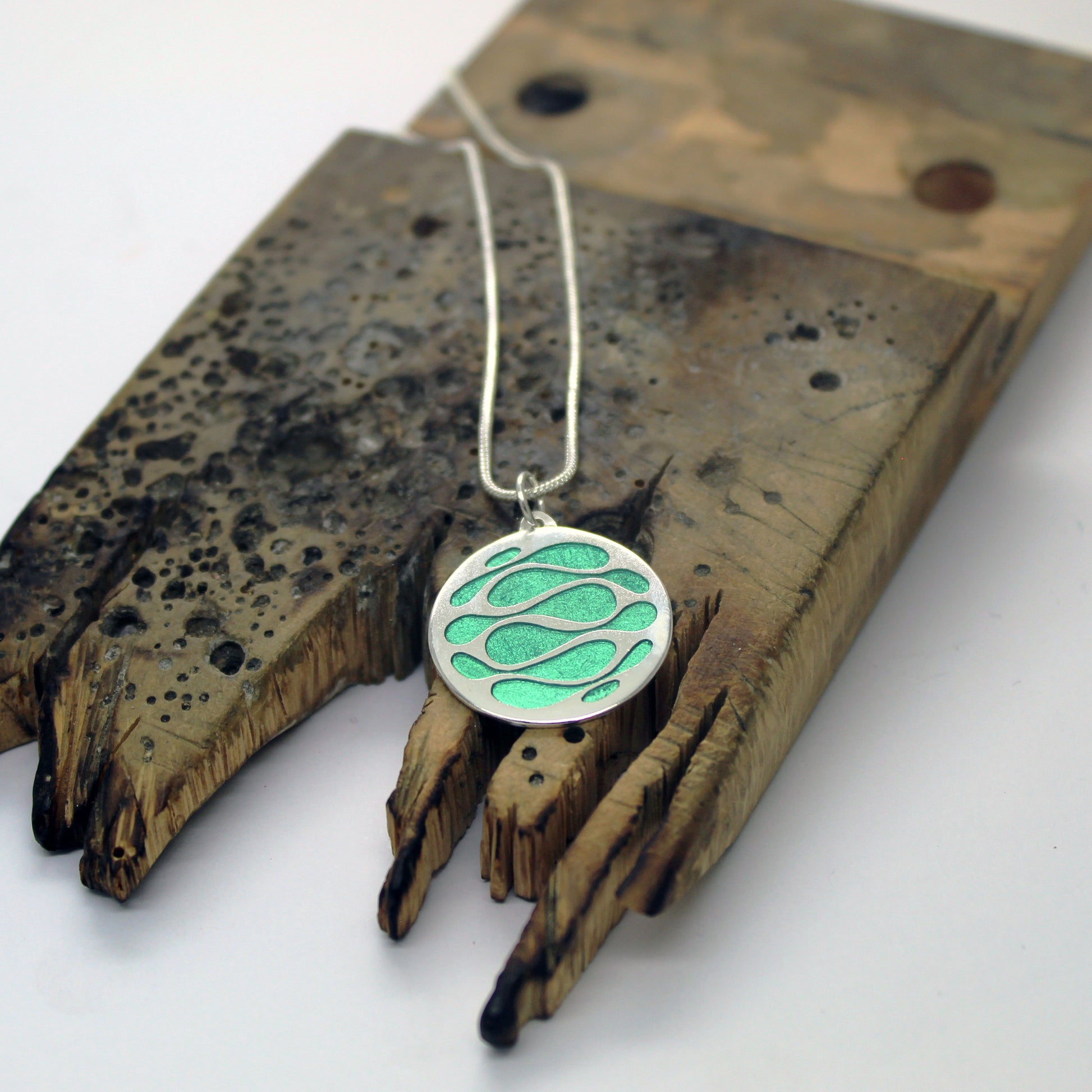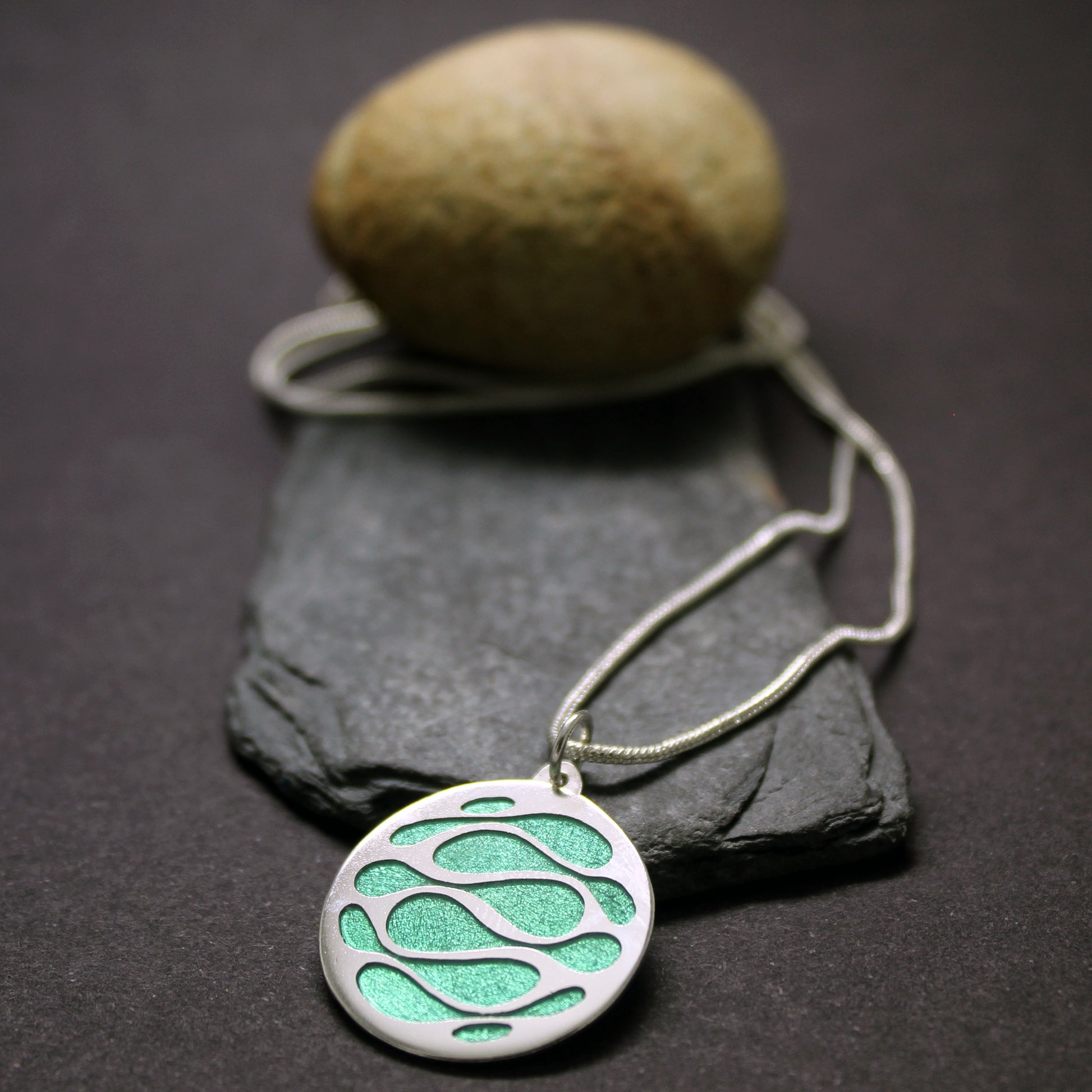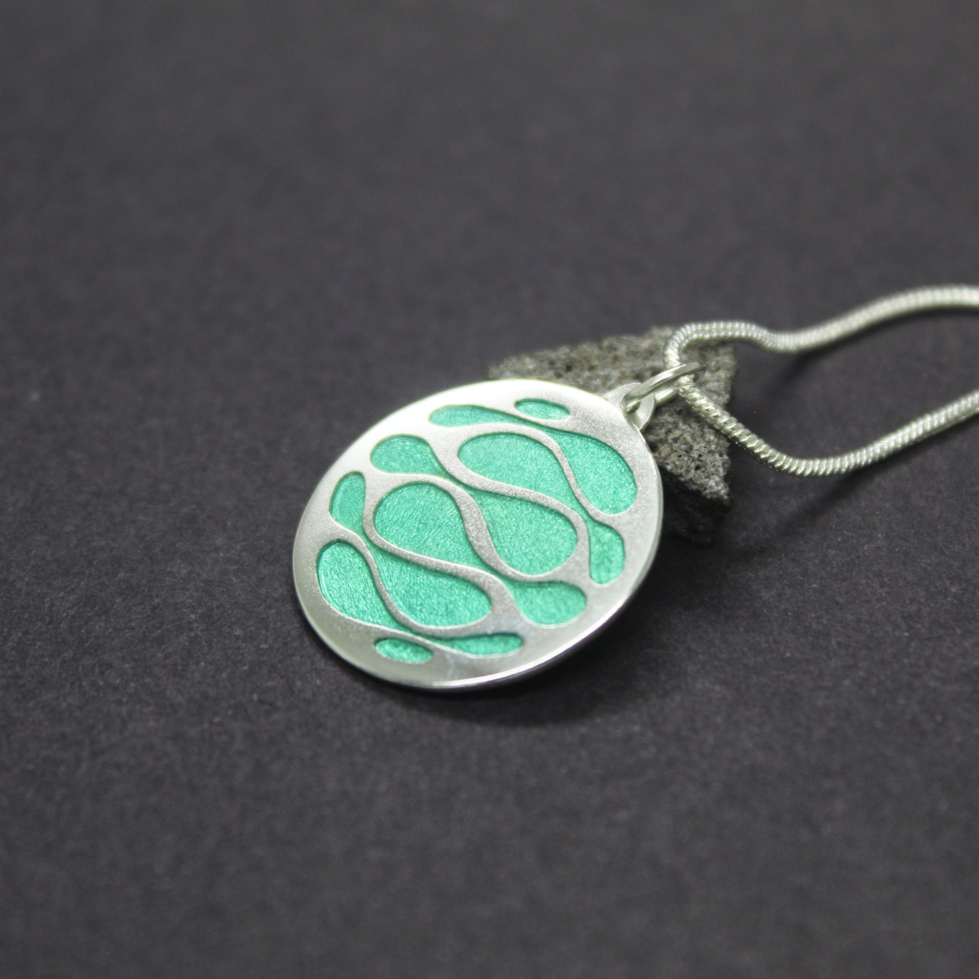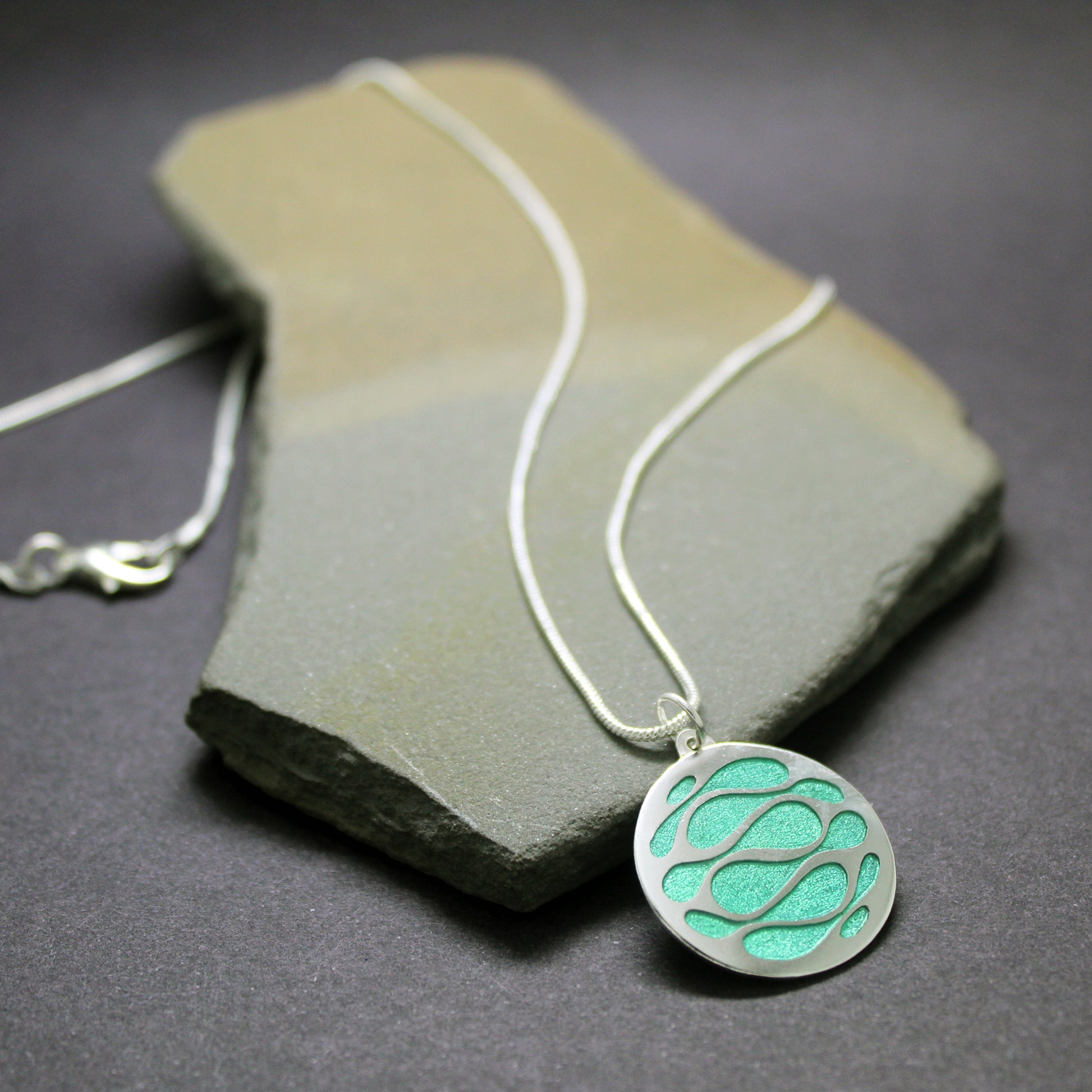 Colgante de plata 925 y resina UV con diseño psicodélico en verde.