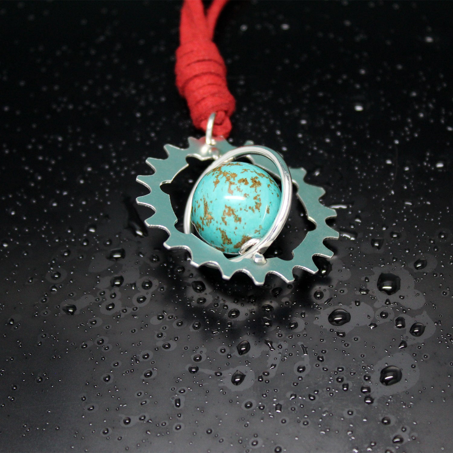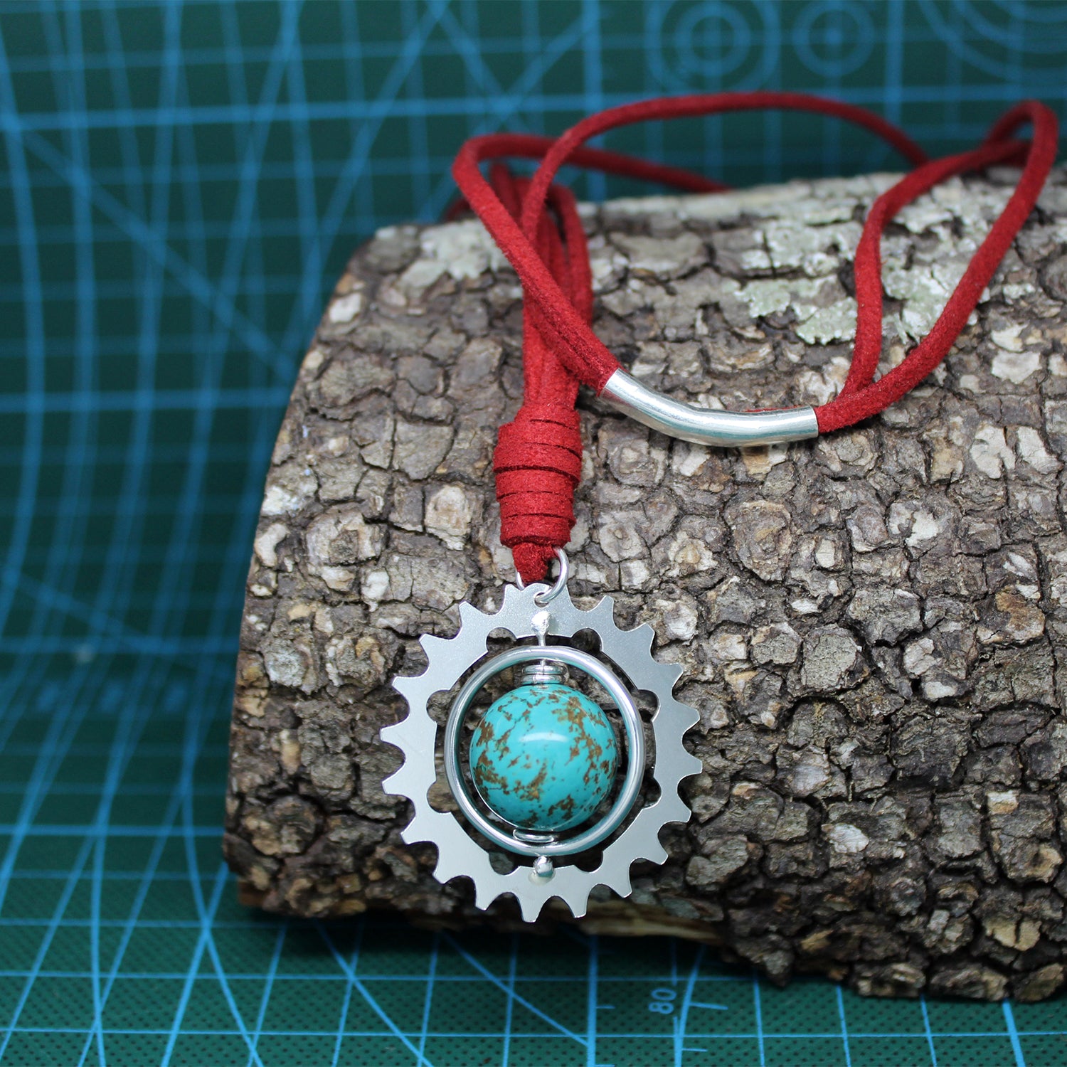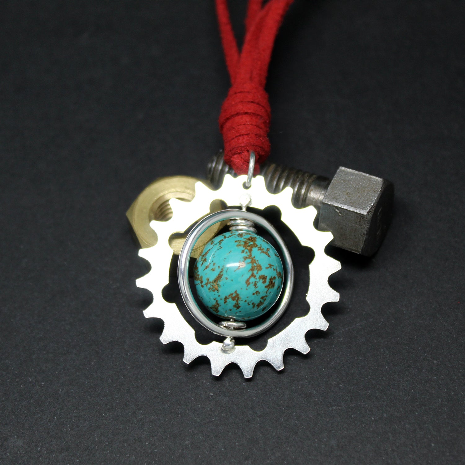 El colgante de Bonnie se compone de una esfera de turquesa enmarcada en un aro que gira entre ella y un gran engranaje realizados ambos en plata 925 y de manera totalmente artesanal. Todo ello prende de un bonito collar de cuero rojo. Se trata de un regalo especial para alguien especial enamorado de la lectura y las aventuras.