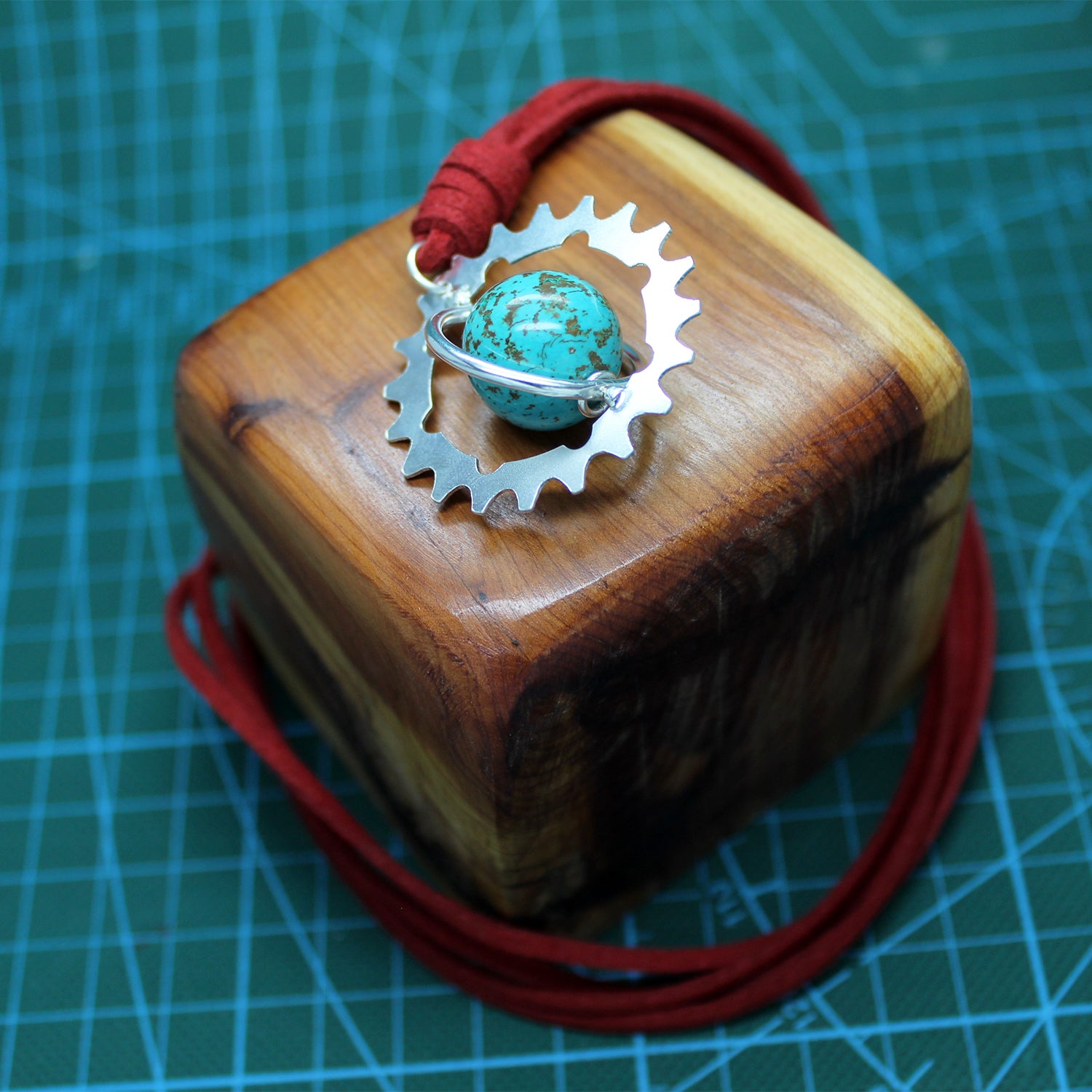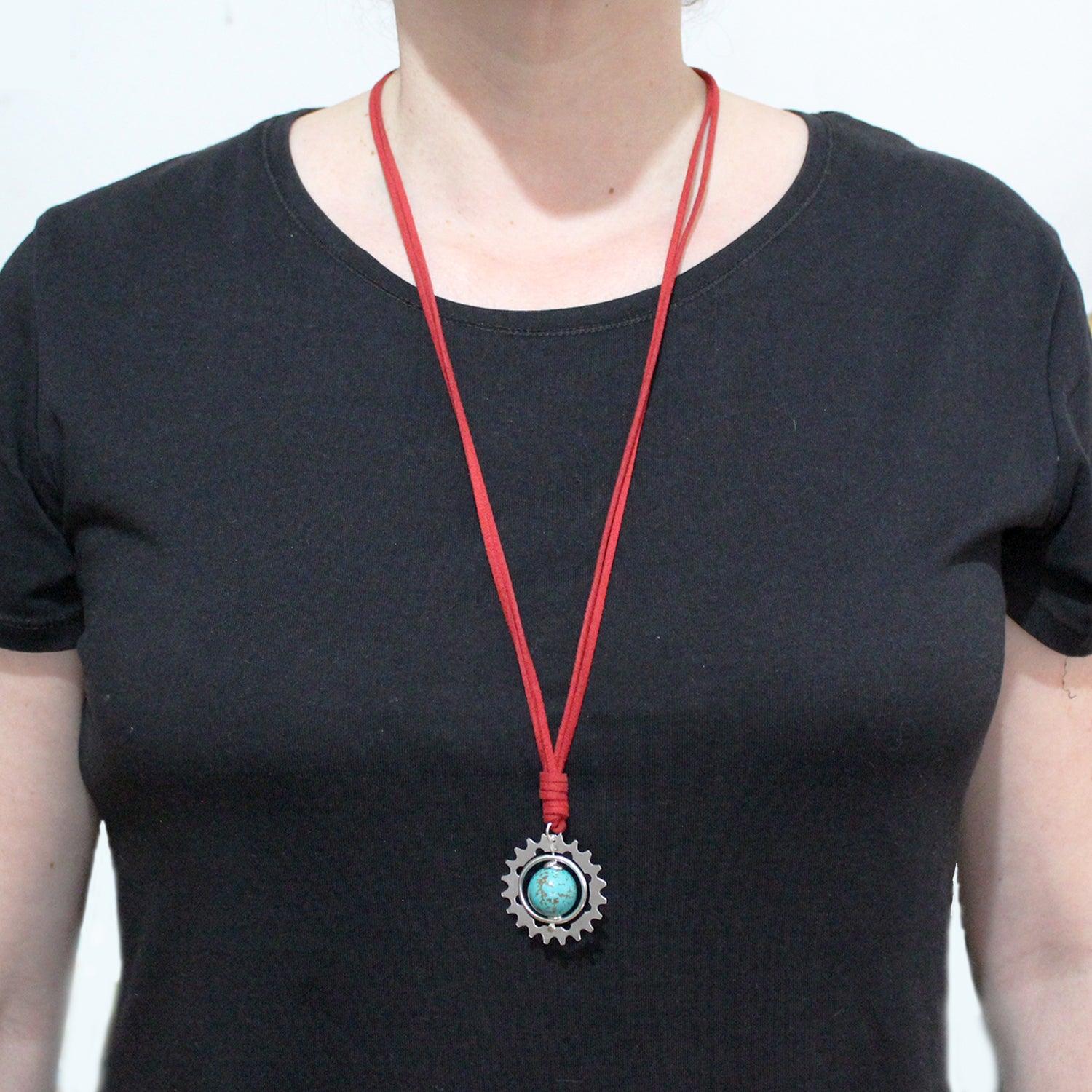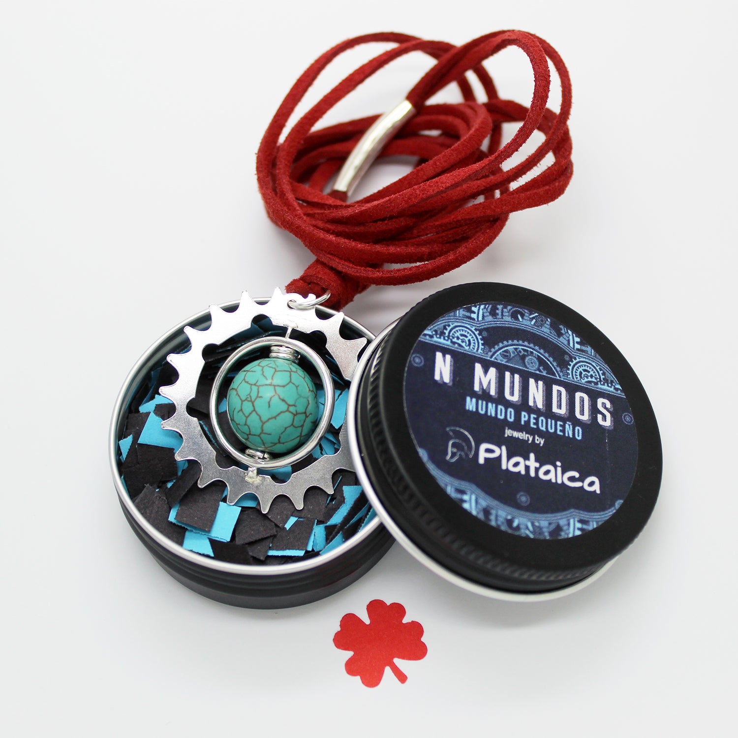 El colgante de Bonnie se compone de una esfera de turquesa enmarcada en un aro que gira entre ella y un gran engranaje realizados ambos en plata 925 y de manera totalmente artesanal. Todo ello prende de un bonito collar de cuero rojo. Se trata de un regalo especial para alguien especial enamorado de la lectura y las aventuras.