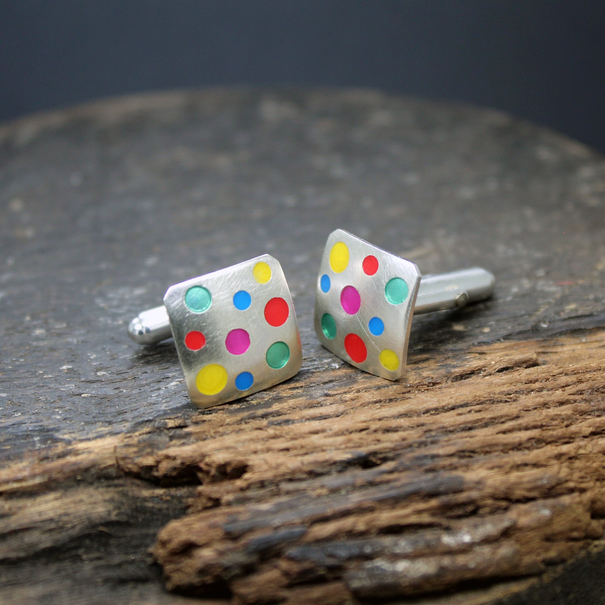 Unos gemelos diseñados para dar una nota de color a cualquier momento solemne. Están realizados totalmente a mano en plata 925 y resina UV y terminados con un acabado "raspado" que intensifica el brillo blanco de la plata. Ideales para ir elegante pero con una nota rebelde.